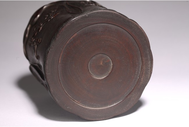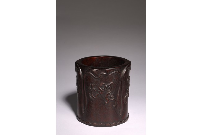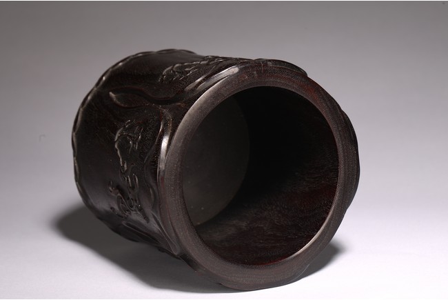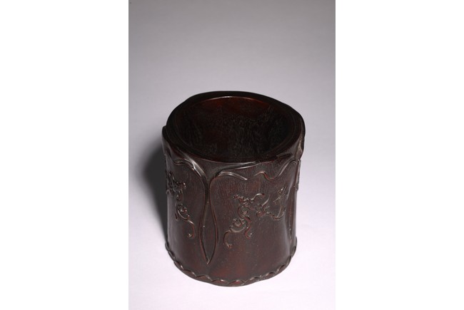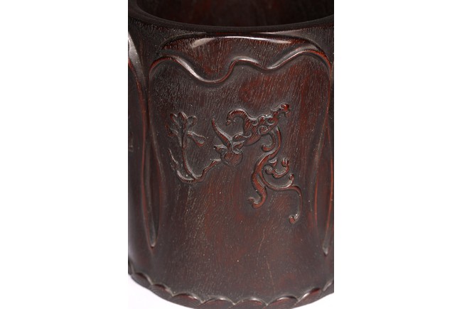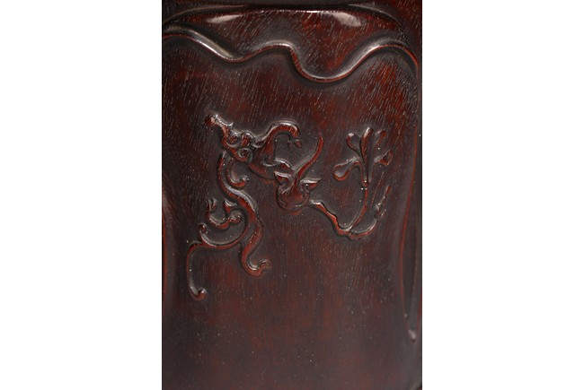 The exterior carved with chilong in relief, the dark brown wood covered with characteristic short golden streaks.