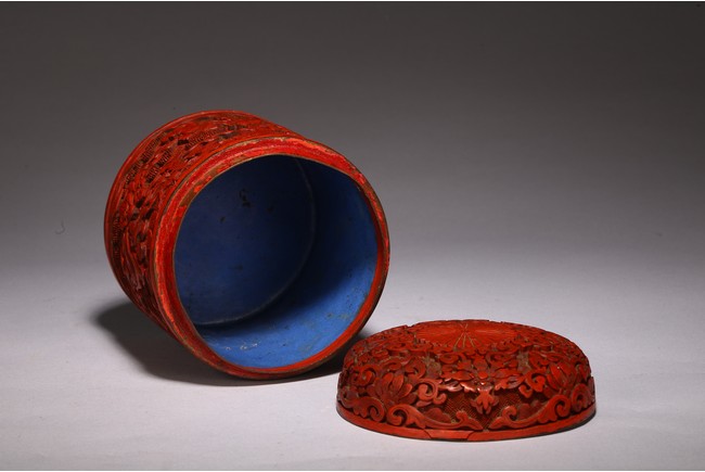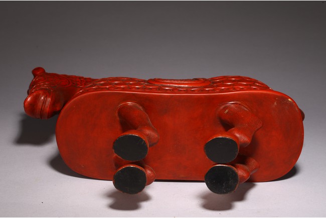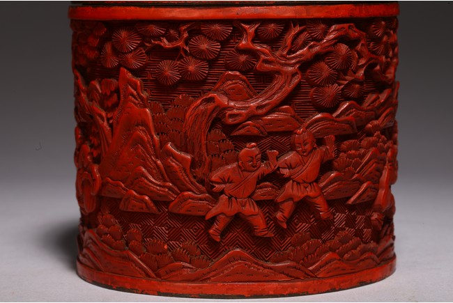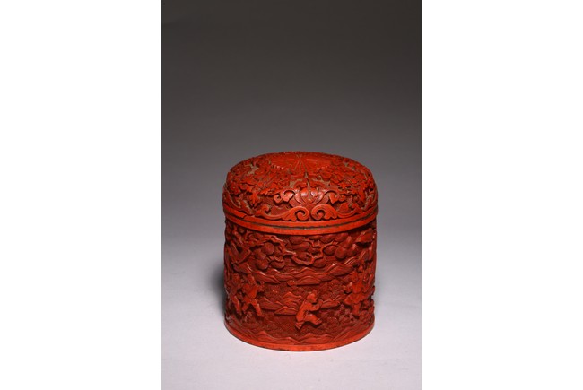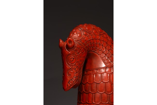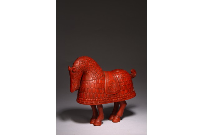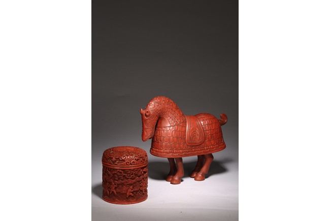 Consisting of a standing cinnabar lacquer horse and a cinnabar lacquer domed box carved with boys around the body. 20th century.
