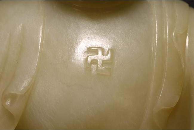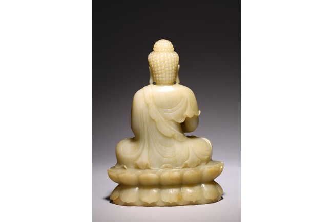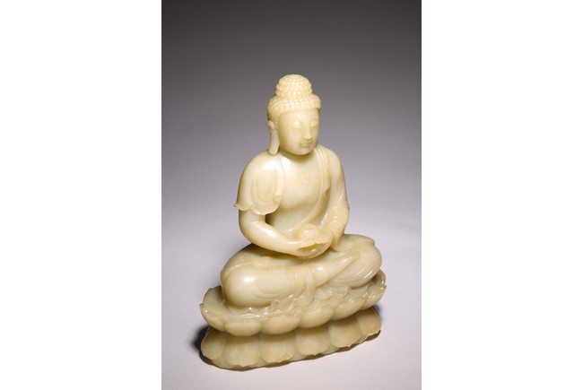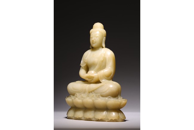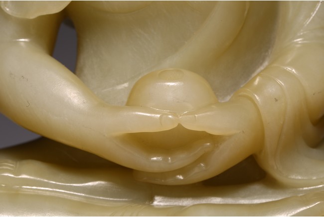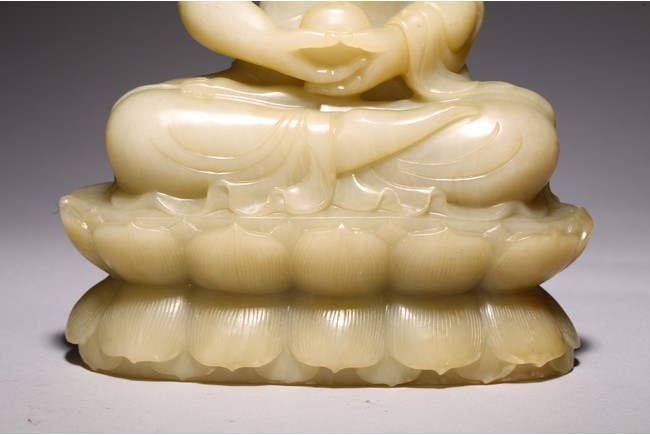 The buddha is intricately carved seated in dhyanasana with both hands holding alms bowl and with a serene expression on carved double lotus petal throne.