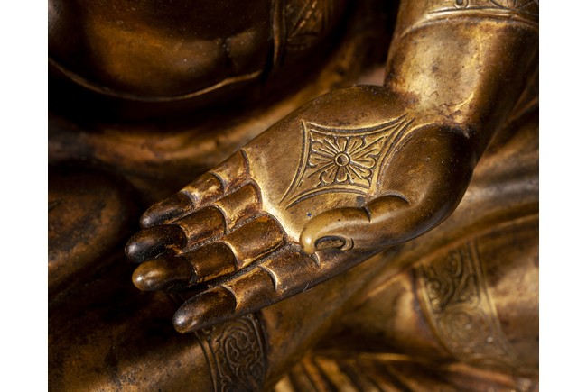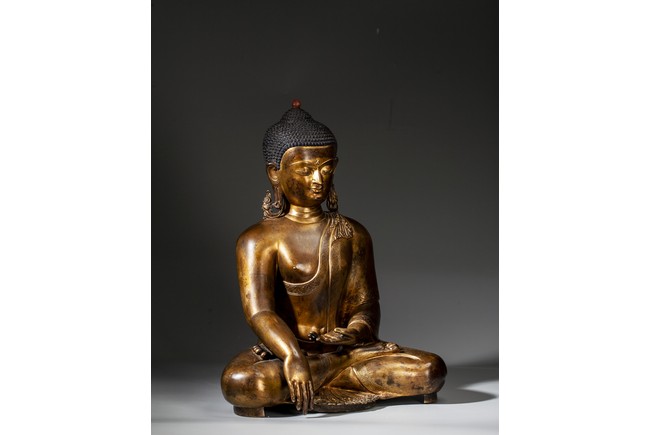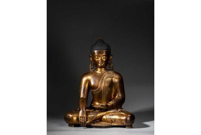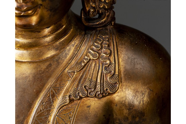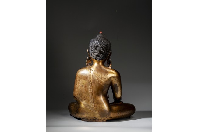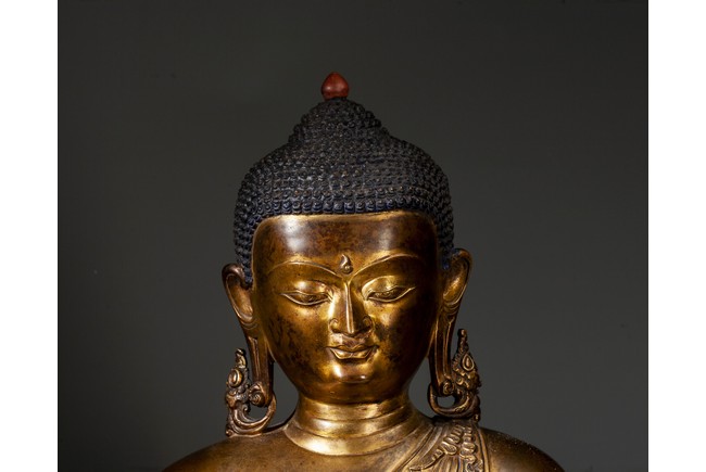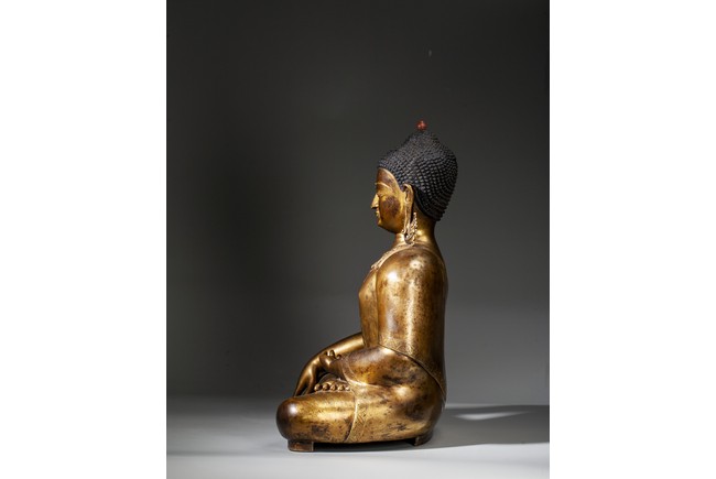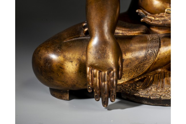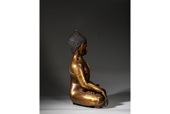 Buddha Shakyamuni wearing a close-fitting robe with the borders elaborately engraved with scrolled patterns, hands in bhumisparsha mudra, and seated in dhyanasana, the face with serene expression and hair pulled into a high chignon.