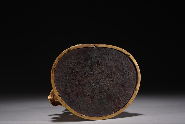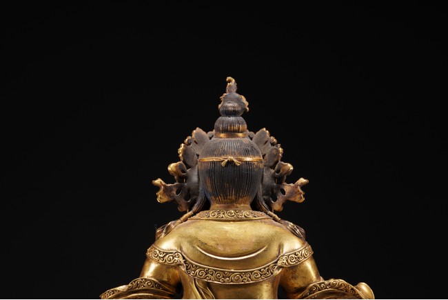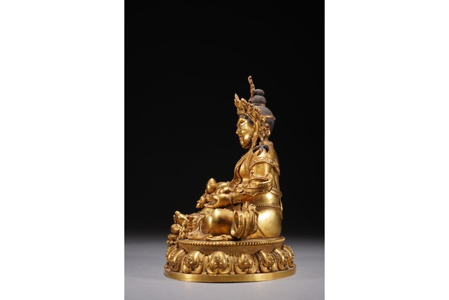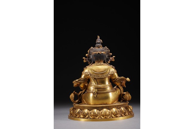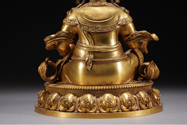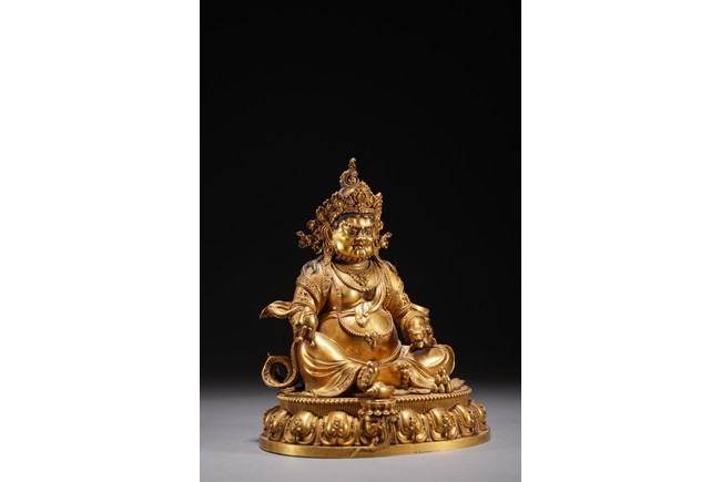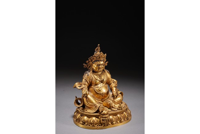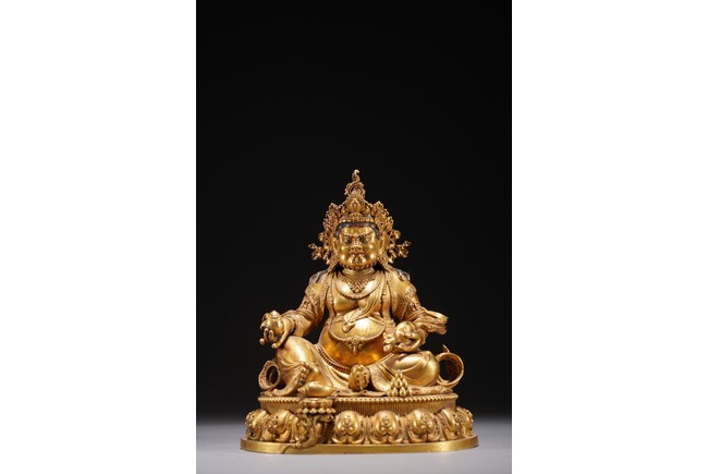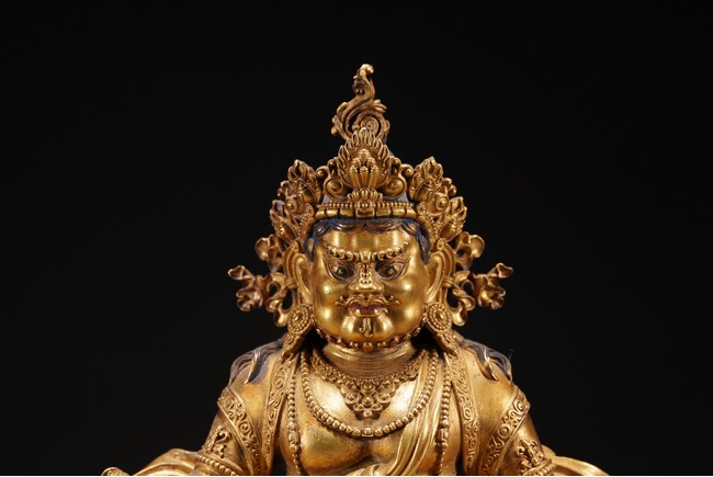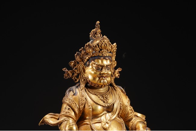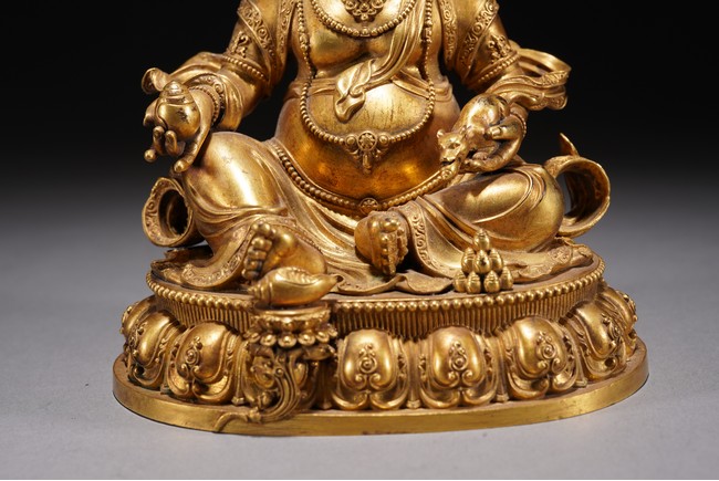 這是一尊西藏風格的作品。通體鎏金,色澤飽滿。寶冠、耳璫、精彩絕倫。頭戴寶冠,穿戴瓔珞與項鍊,披天衣,著長裙,左手抓握吐寶鼠、鼠嘴裡含著一顆大摩尼寶珠,右手持菴摩勒果,遍體金黃,舒坐在寶座上,右足踩在湧出寶物法螺。坐姿相當威武。