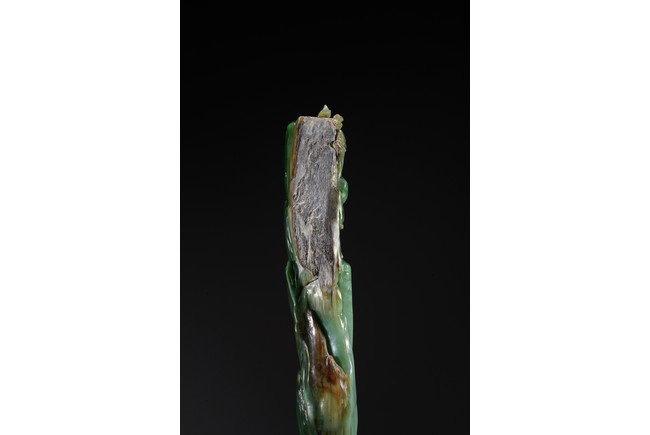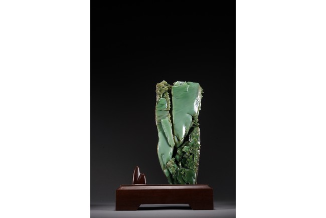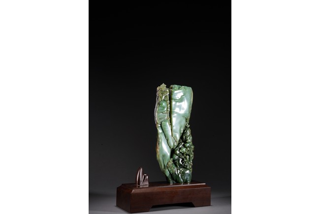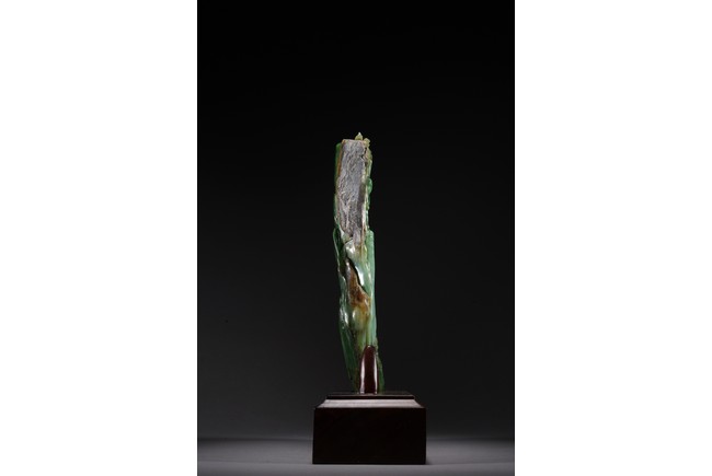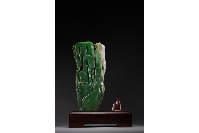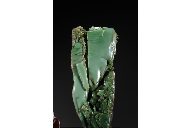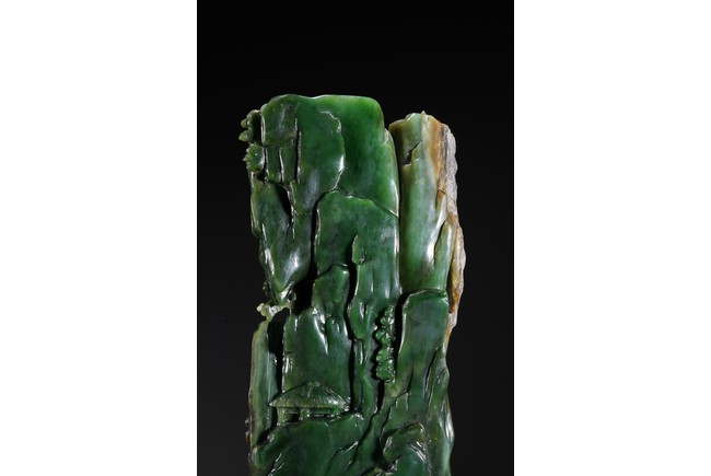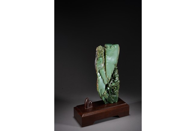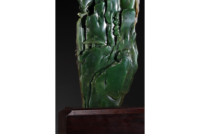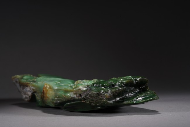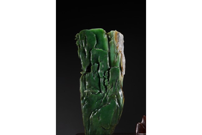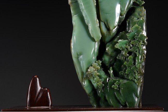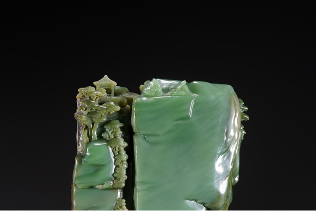 取整塊碧玉籽料,留有原皮色,色彩翠綠青綠相間,及其自然,巧雕高山流水,欲有飛瀑而下,山間亭台,二位高士對坐山巔,意境高遠,難得精品佳作。