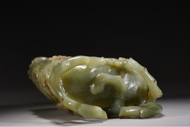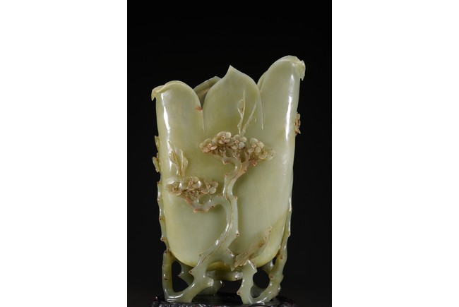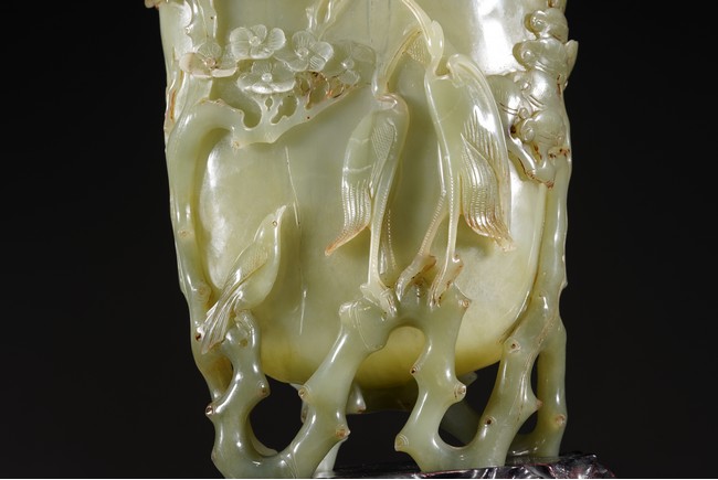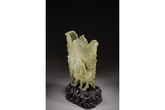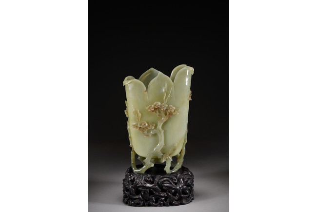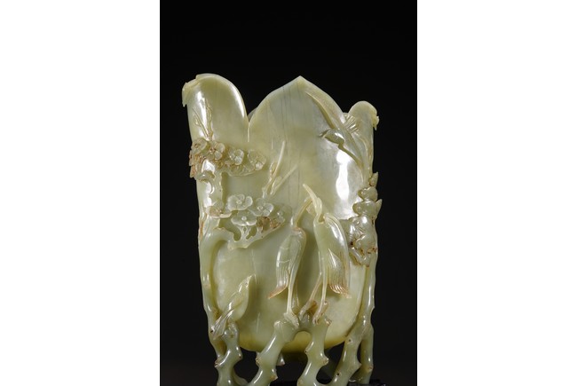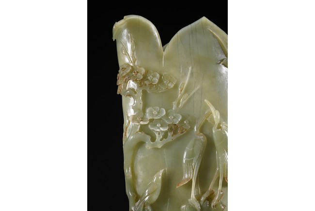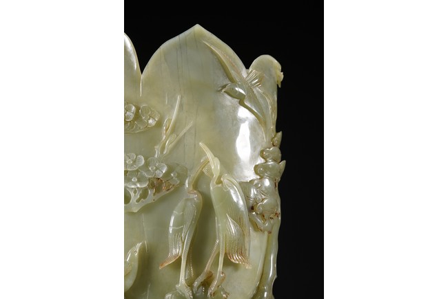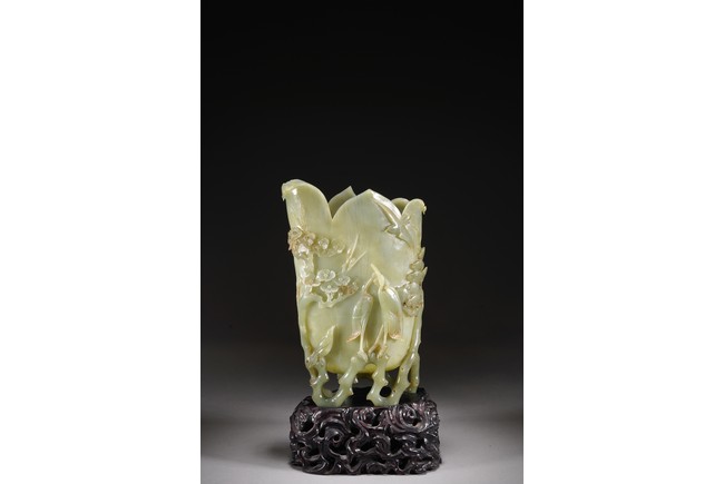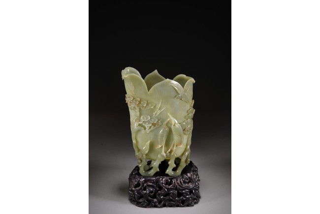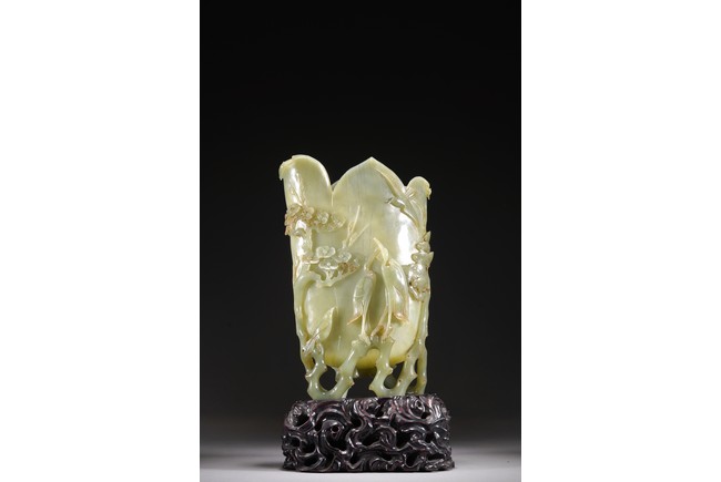 花插和田青白玉材質,用料碩大,採用圓雕鏤雕技法,雕琢通景松鶴延年,雕工細膩精湛,掏堂規整,原配紫檀底座,難得完整精工大器。