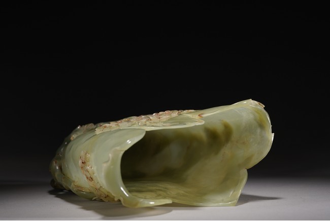 Carved in the form of a large curled up leaf forming the vessel, the exterior carved in relief with birds and trees, supported on gnarled branch forming the base.