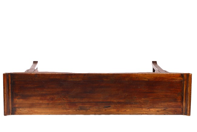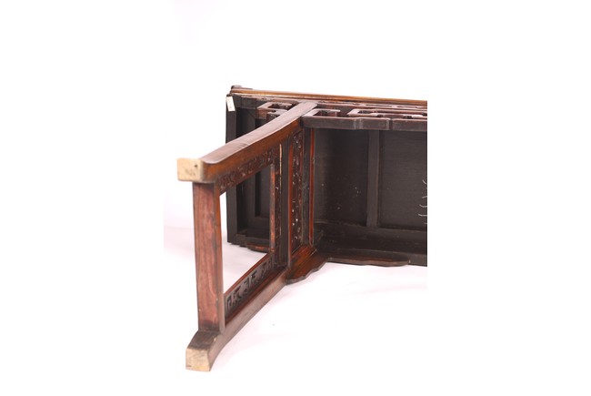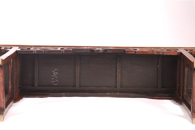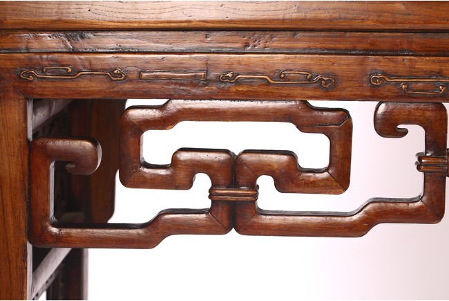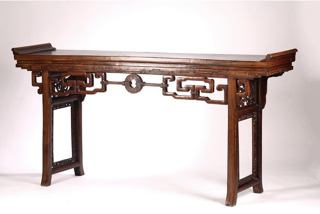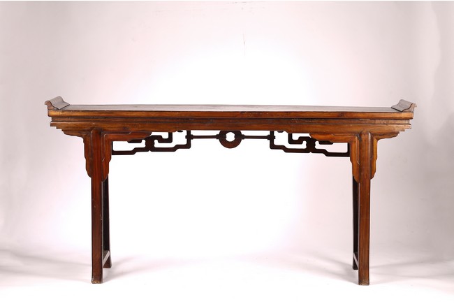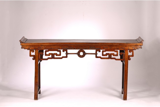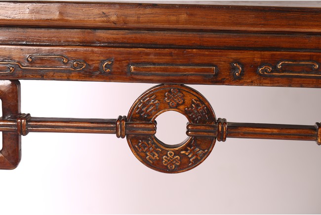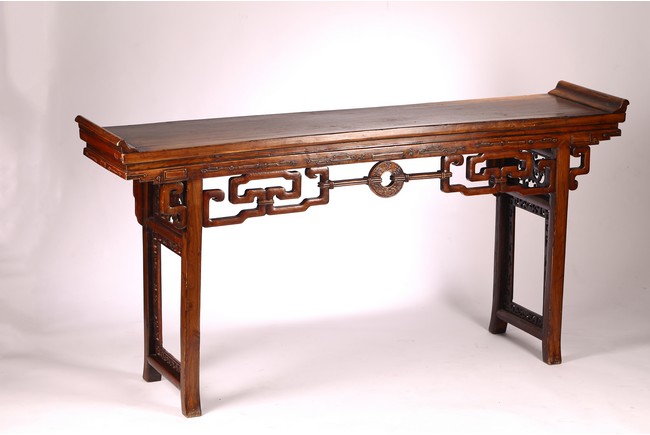 With upturned scrolling terminals, the single board top set above frieze of pair of ruyi-cloud fretwork flanking a bi disc. Qing Dynasty period.