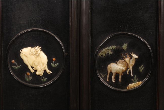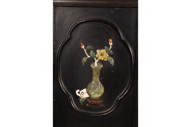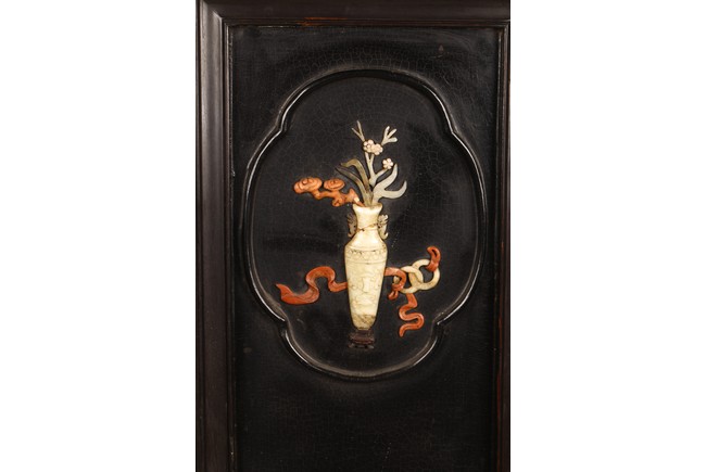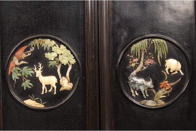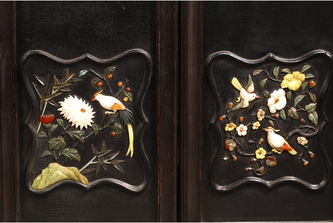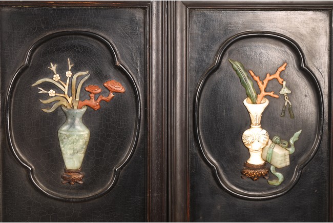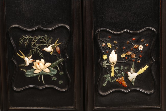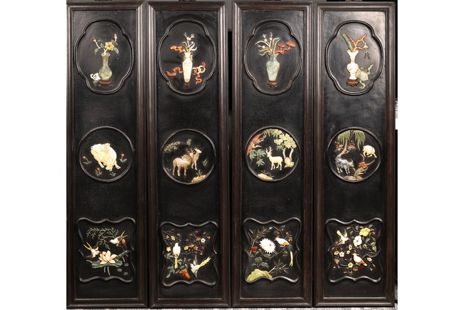 Consisting of four panels, each inlaid with various jades, soapstones, agate, ambers ,etc. to depict vases, animals, and birds perching on trees, rosewood frames. Republic period.