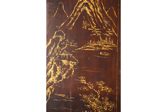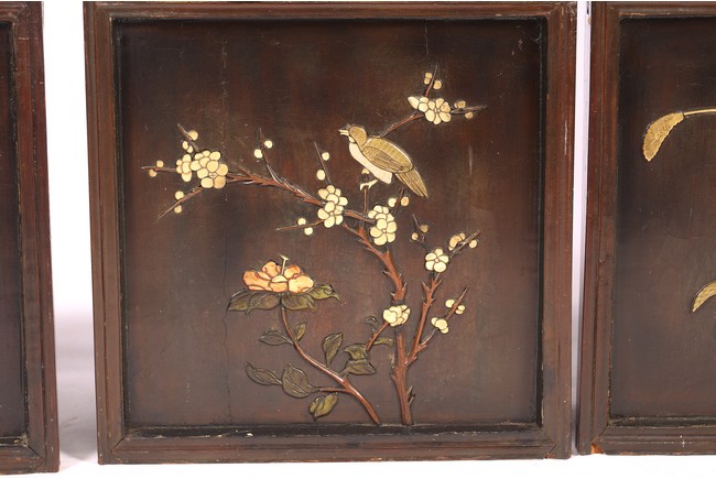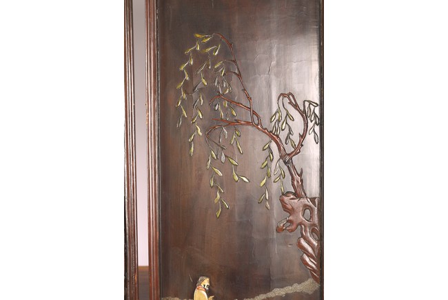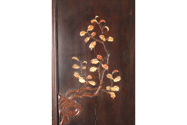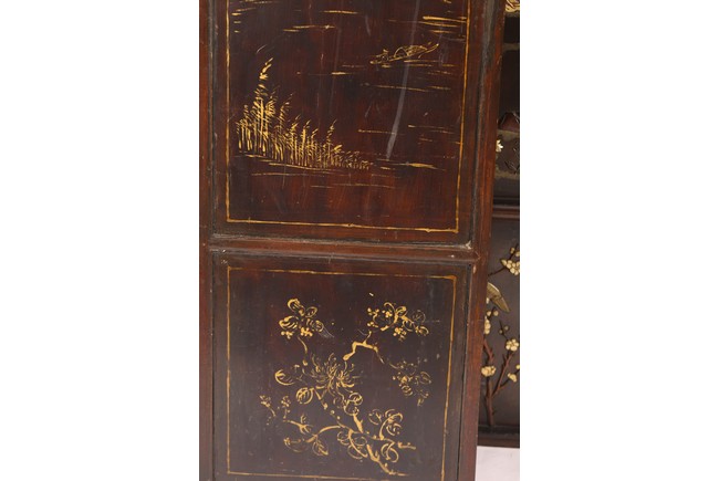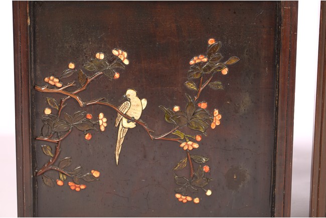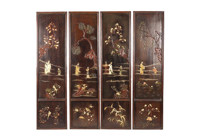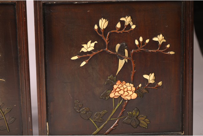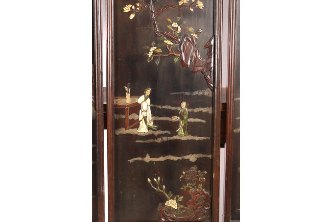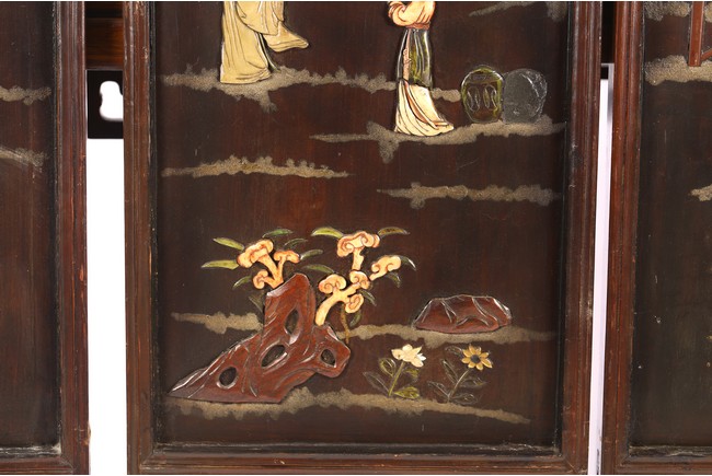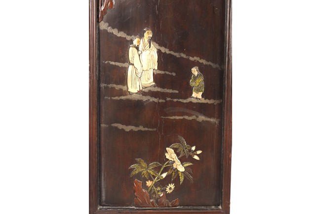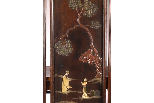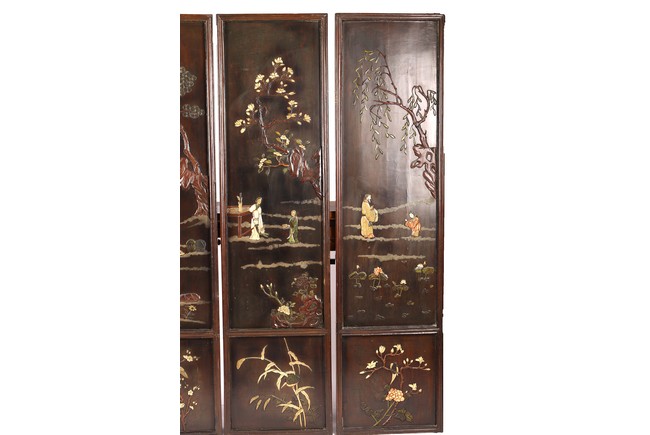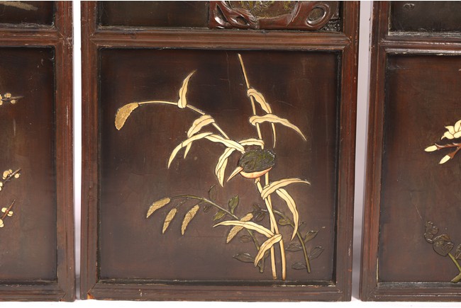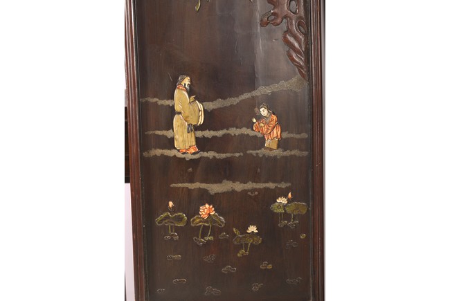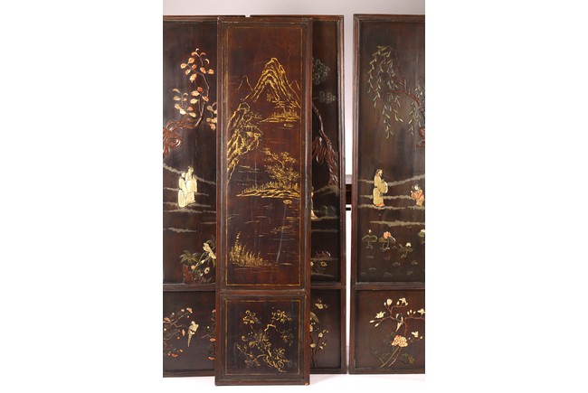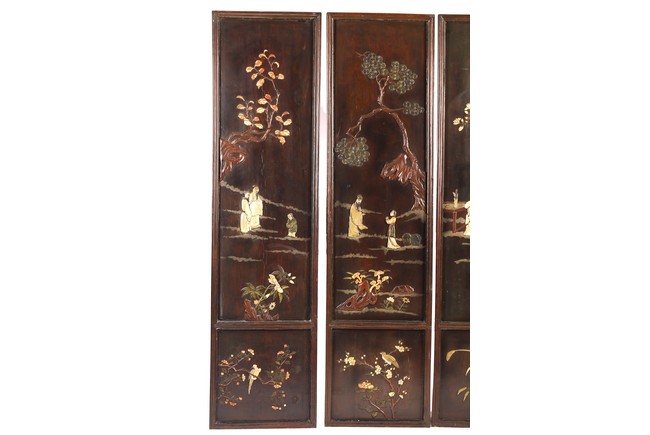 Chinese. Each screen panel inlaid with various jades and soapstones to depict story scenes of figures in garden setting, the reverse gilt painted with landscape scenes. Qing Dynasty period.
