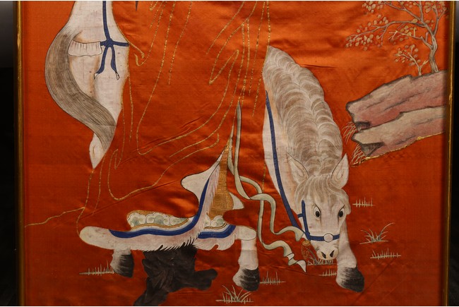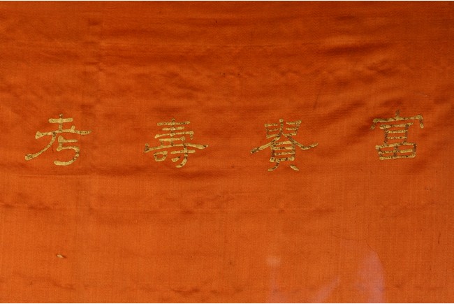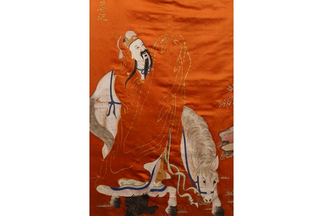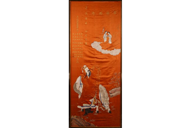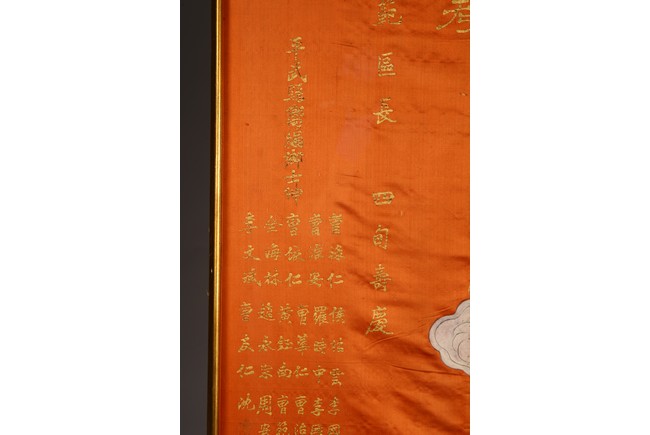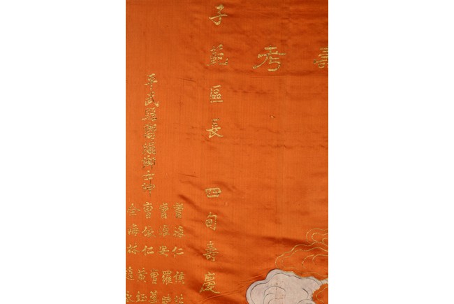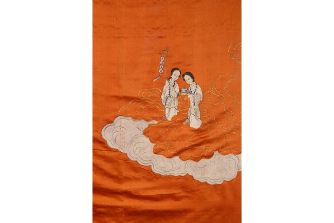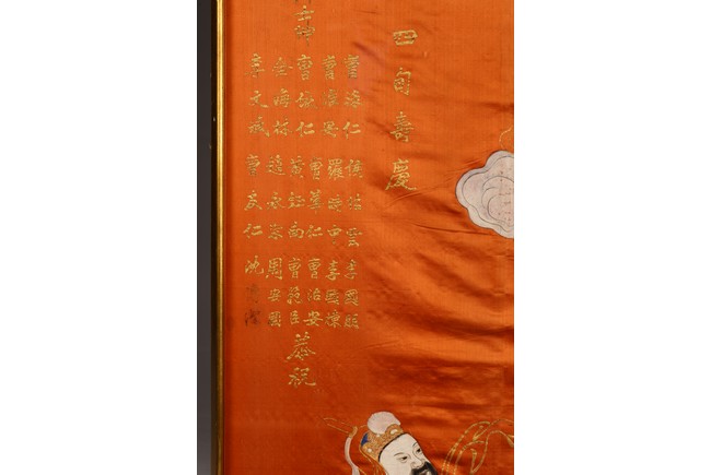 This rectangular panel embroidered with an official figure worshipping two female deities on cloud above, with embroidered inscriptions and names on the top left. Republic period.