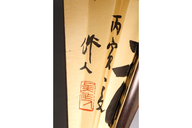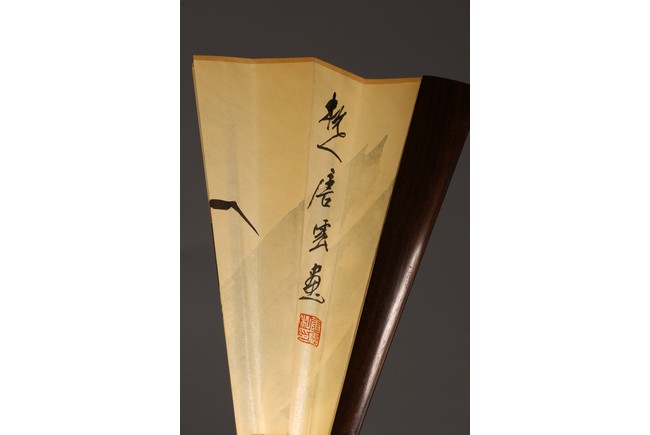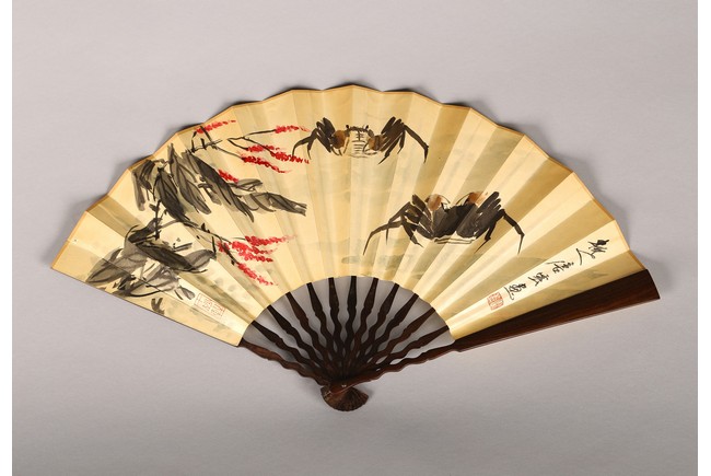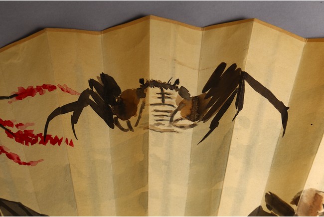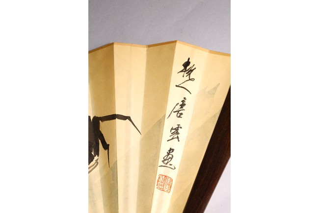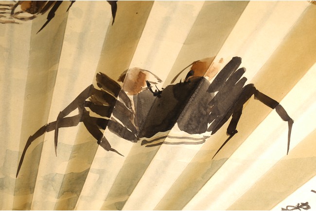 Color and ink on paper. Crabs. Fan painting. Inscribed and signed Tang Yun with two seal mark; the back with four character calligraphy and signed Zuo ren, with one seal mark.