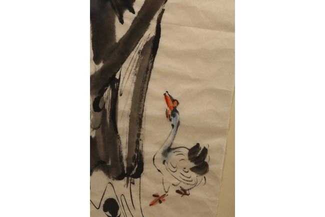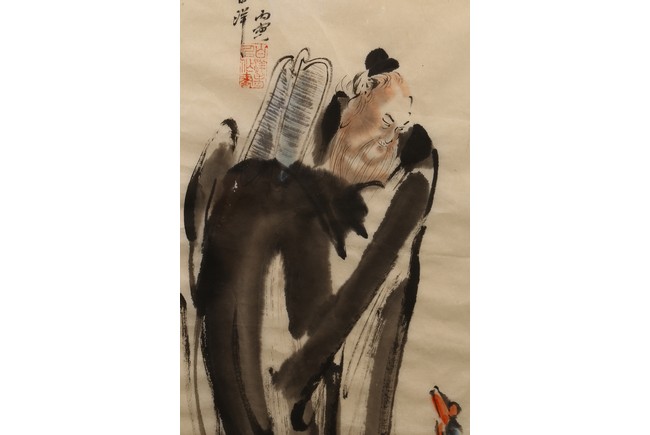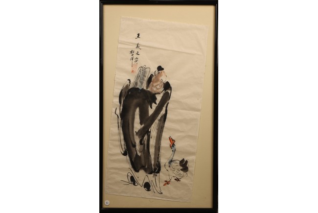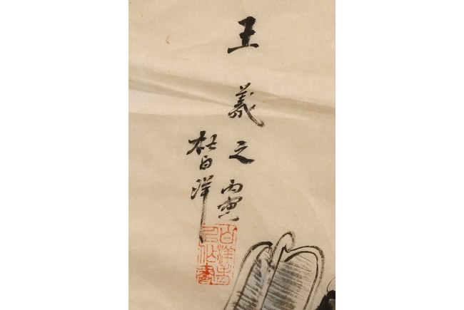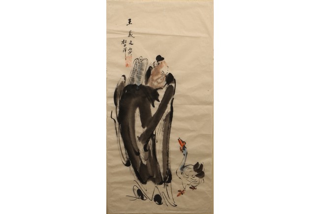 Color and ink on paper. Wang Xizhi and goose. Inscribed and signed.