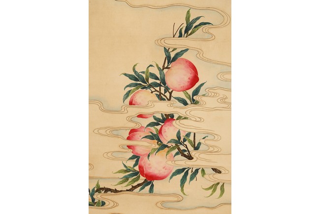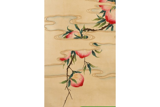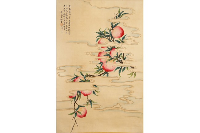 Color and ink on paper. Peaches. Hanging scroll. Inscribed and signed Jiang Song Mei Lin.
