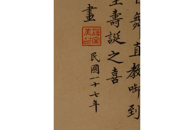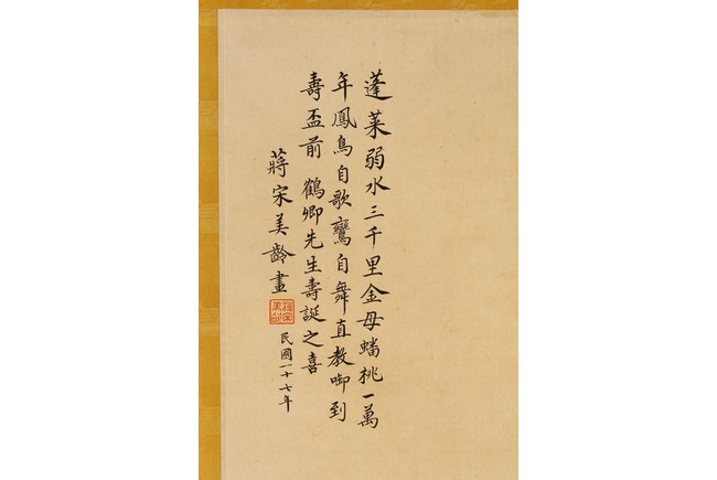 Provenance: Property from a Chinese American family collection, Los Angeles 題識: 蓬萊弱水三千里,金母蟠桃一萬年,鳳鳥自歌鸞自舞,直教銜到壽尊前。鶴卿先生壽誕之喜。 蔣宋美齡畫 民國一十七年 鈐印: 蔣宋美齡 來源: 洛杉磯華裔家族收藏,由家族第三代提供