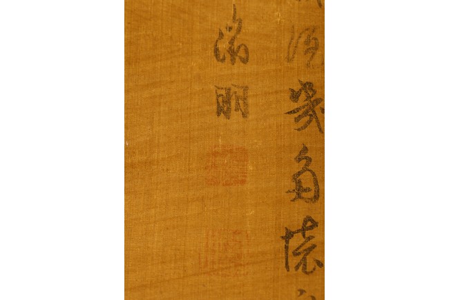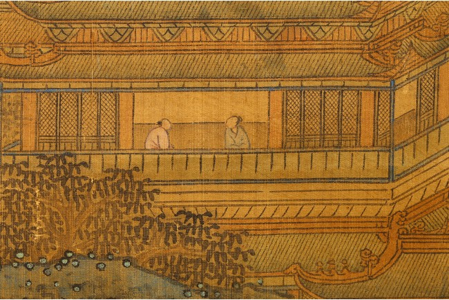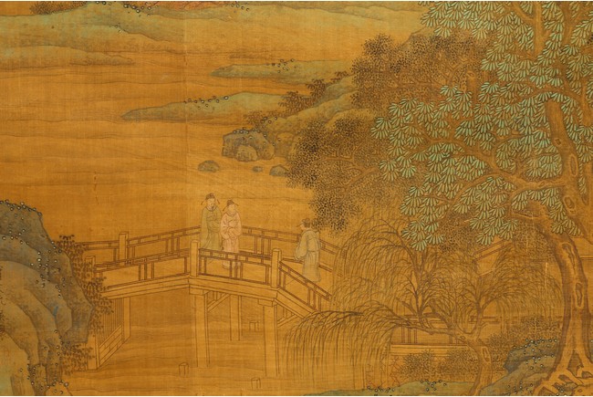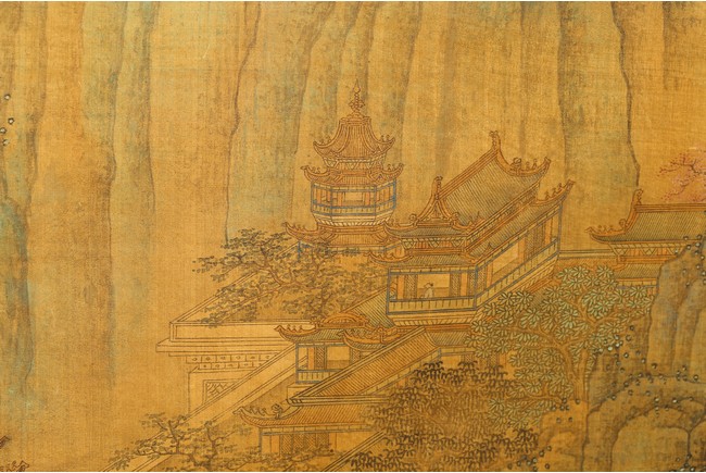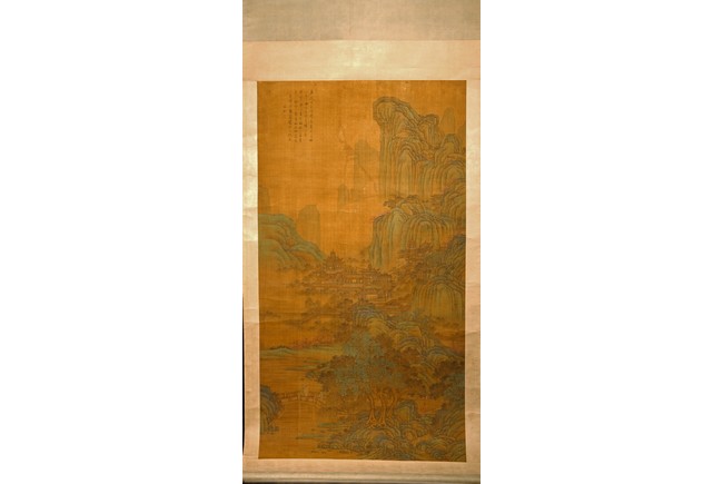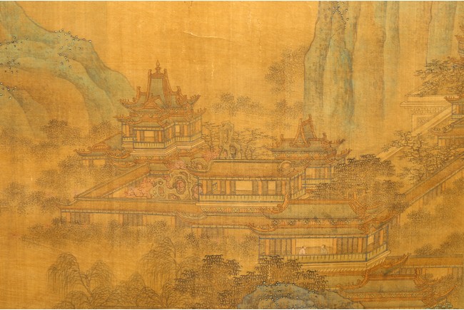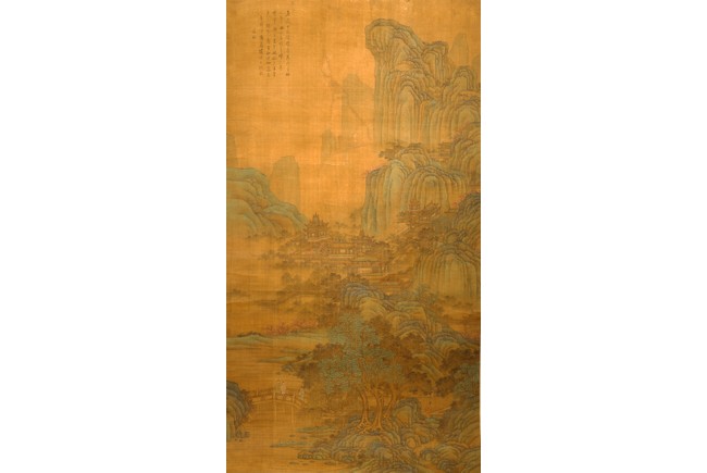 Color and ink on silk. Green and Blue landscape and palaces. Inscribed and signed Zhengming, with two seal marks of the artist. Attributed to Wen Zhengming.