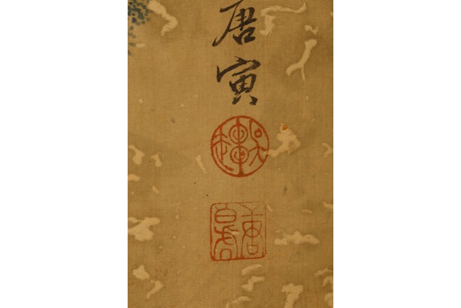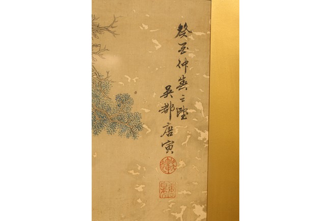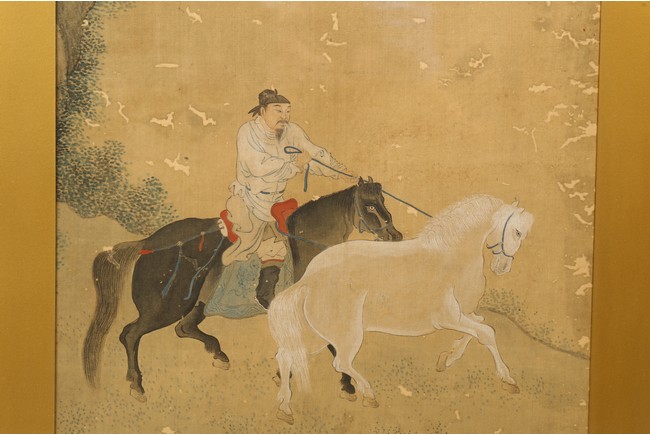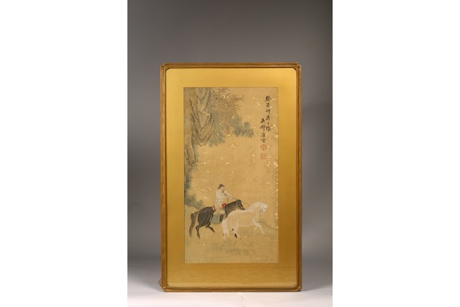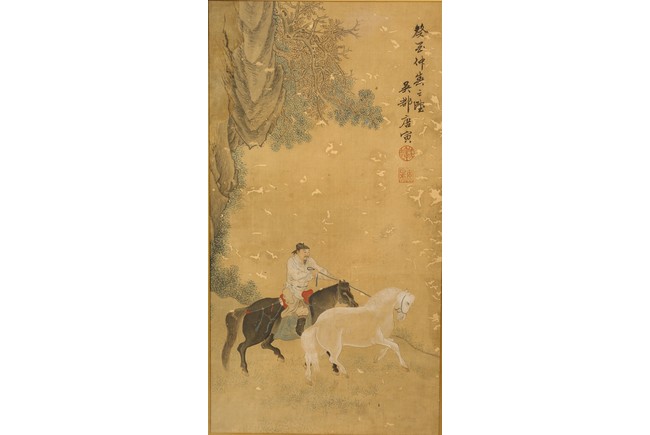 Color and ink on silk. Horses and figure. Inscribed and signed Tang Ying, with two seal marks of the artist. Framed.