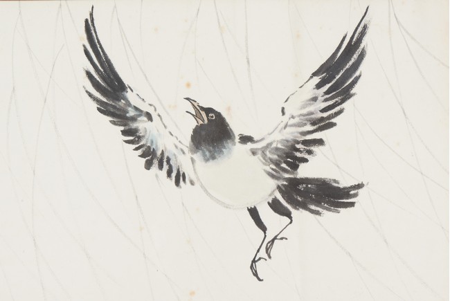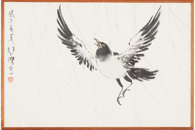 Color and ink on paper. Magpie. Framed. Inscribed and signed Beihong, with one seal of the artist, dated to summer of 1943.