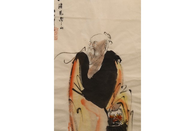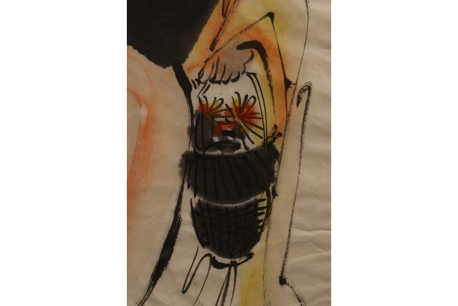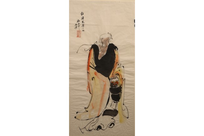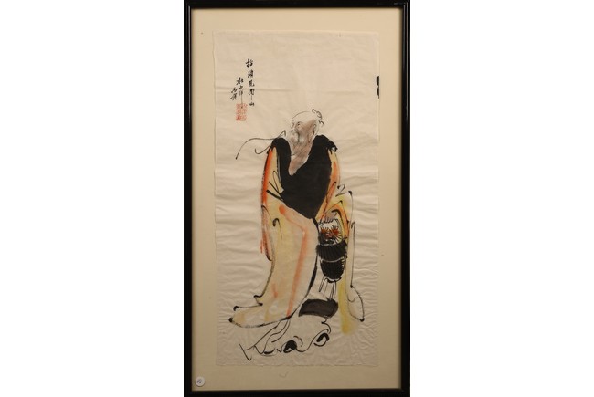 Color and ink on paper. Figure. Framed. Inscribed and signed.