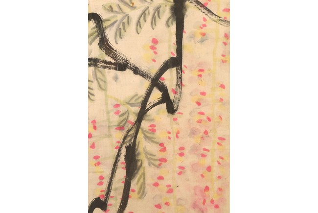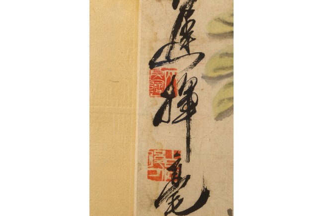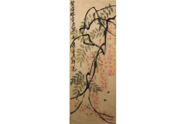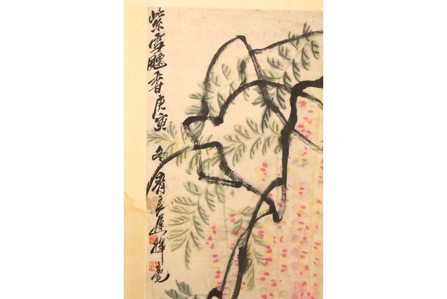 Color and ink on paper. Wisteria. Framed. Inscribed and signed Qi Liangchi, with two seal marks of the artist.