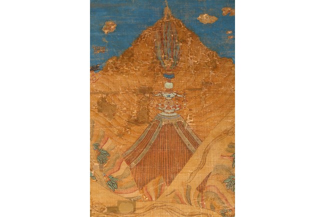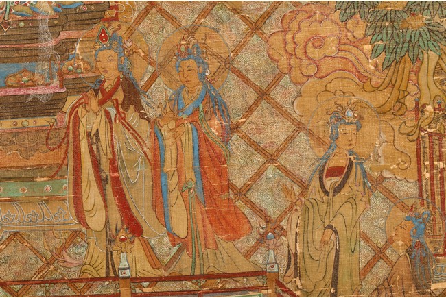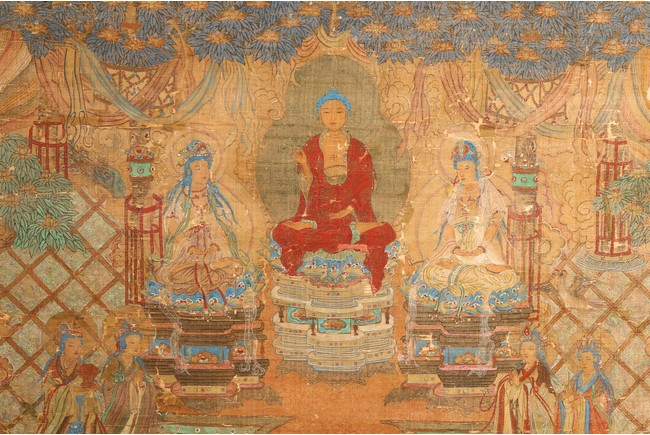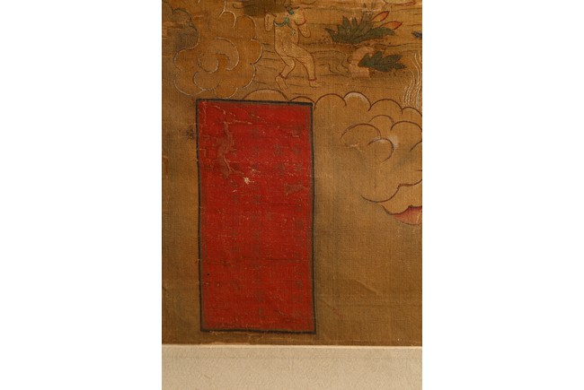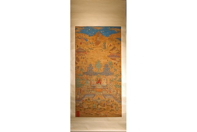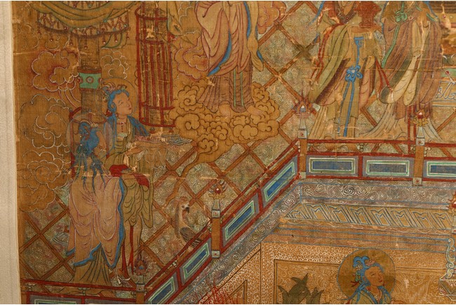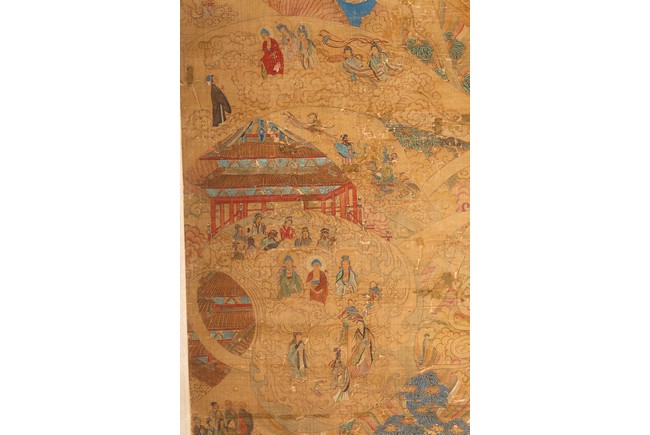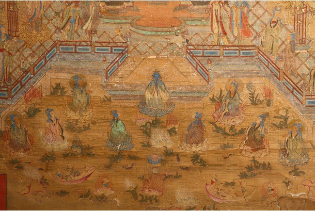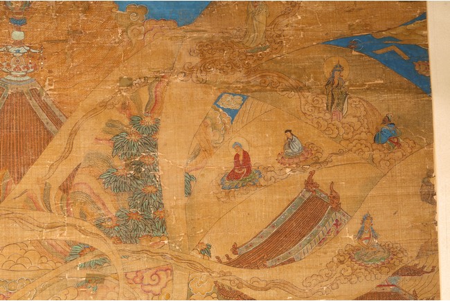 Hanging scroll. Ink and color on silk, portraying the Shakyamuni Buddha on the throne, surrounded by other Buddhas and flanked by Mahasthamaprapta and Avalokiteshvara, with further deities and Apsara in the background amidst clouds and pavilions, the lower left with an inscription dedicated to the mother of the artist. Qing Dynasty period.