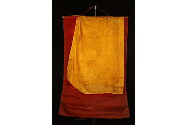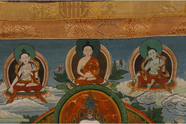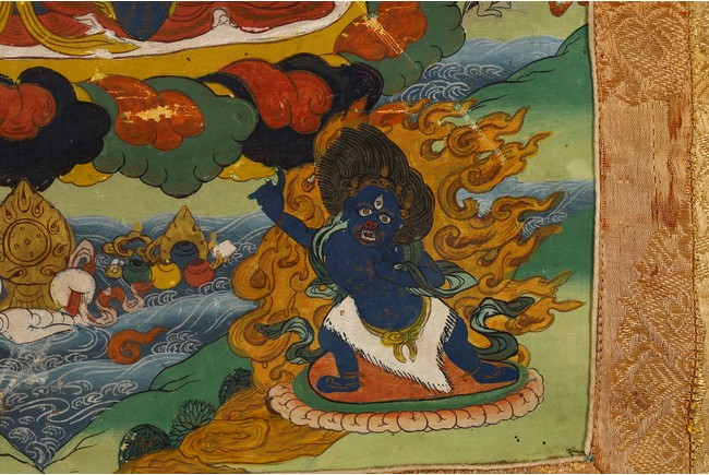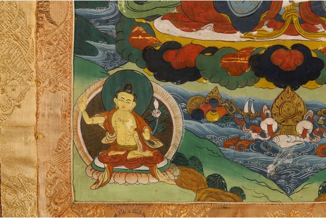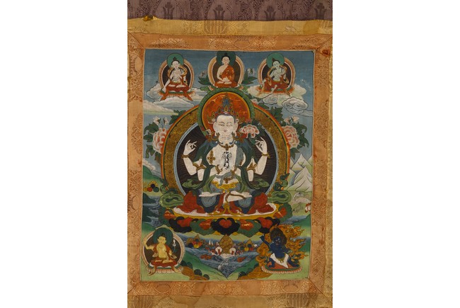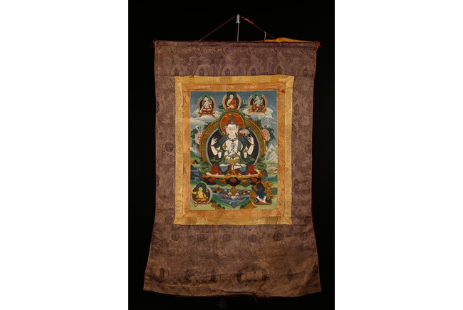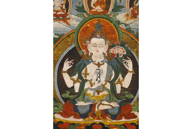 Tibetan School. The white-skinned deity seated on a lotus base over a stepped throne, holding a lotus in one of hands, backed by a golden mandorla and red mandala, and Amitayus with Vajrasattva and White Tara above, and Manjushri, Vajrapani at bottom. 19th century, Qing Dynasty period.