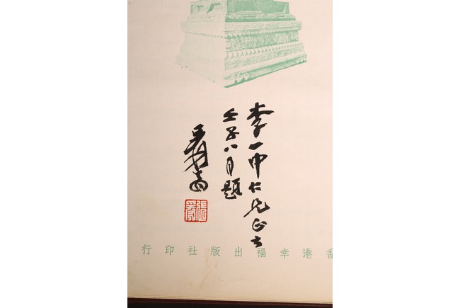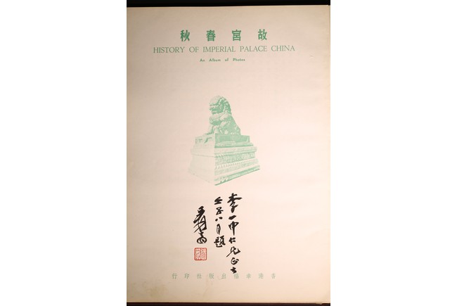 The title page with signature of Zhang Daqian, dedicated to Li Yizhong, dated to August of 1972, with one seal mark. The book titled 'History of Imperial Palace China' was published and printed in Hong Kong.