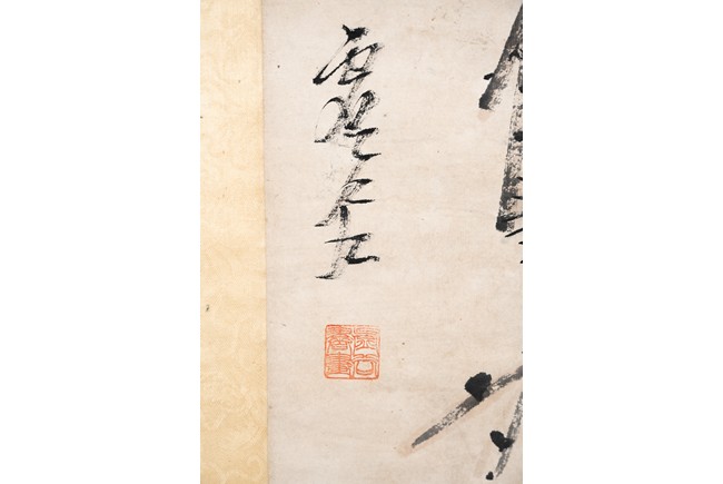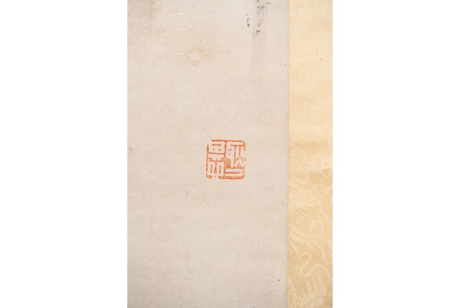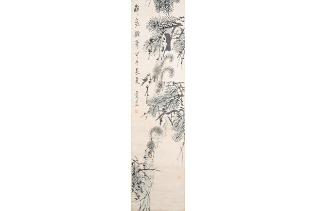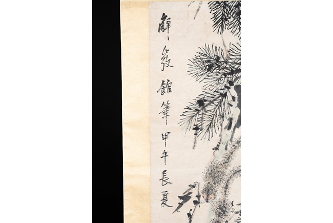 題識:甲午長夏虛谷;鈴印:虛谷書畫。(虛谷:清代著名畫家,海上四大家之一,有「晚清畫苑第一家」之譽。俗姓朱,名懷仁,僧名虛白,字虛谷,初任清軍參將與太平軍作戰,意有感觸,後出家爲僧。工山水、花卉、動物、禽鳥,尤長於畫松鼠及金魚。亦擅寫真,工隸書。作畫有蒼秀之趣,敷色清新,造型生動,落筆冷消,別具風格。)