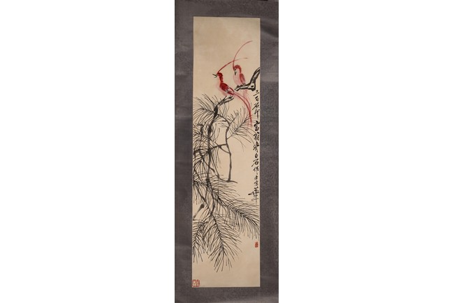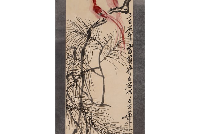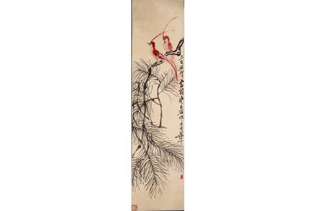 Chinese. Qi Baishi. Color and ink on paper. 'Paradise Flycatcher on Pine Tree'. Mounted on paper. Inscribed and signed Qi Baishi, with two seal marks of the artist.