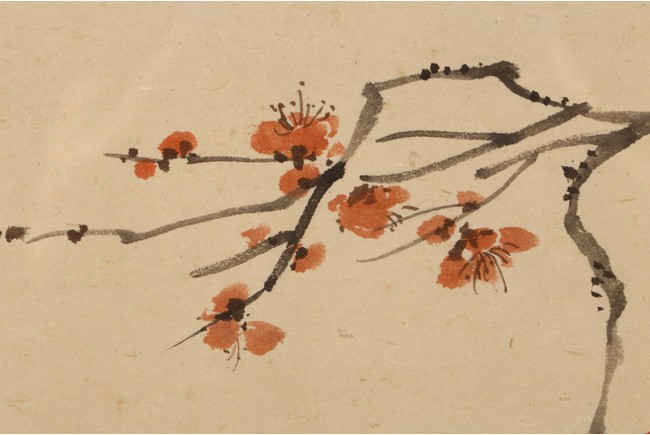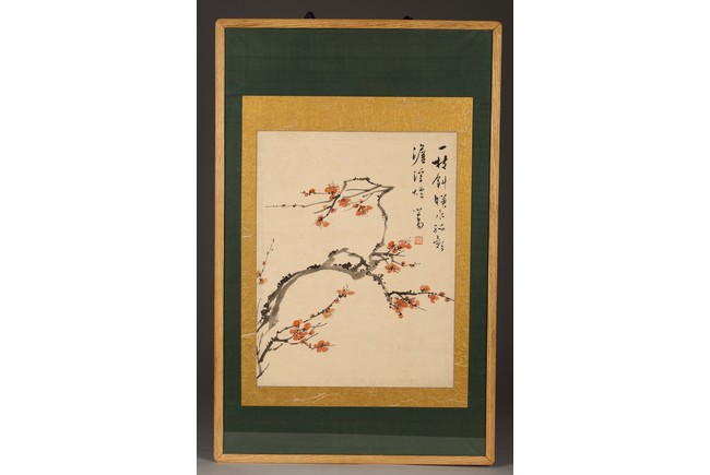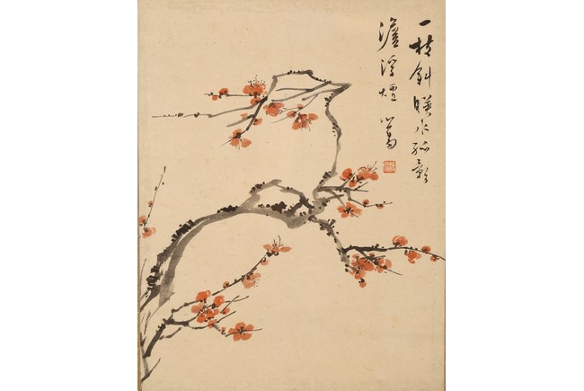 Color and ink on paper. Prunus. Inscribed and signed Xinyu, with one seal mark of the artist. Framed.