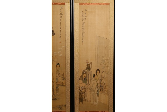 Color and ink on silk. Set of four. Figures. Framed. Inscribed and signed Qian Huian, with four seal marks of artist in total.