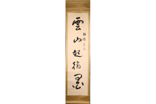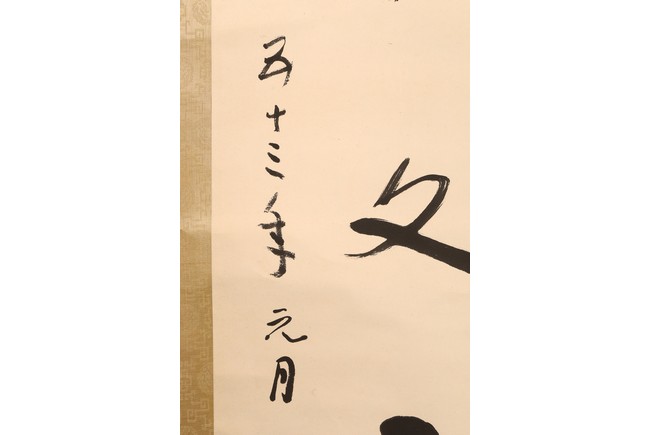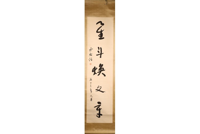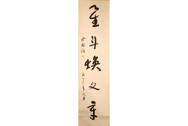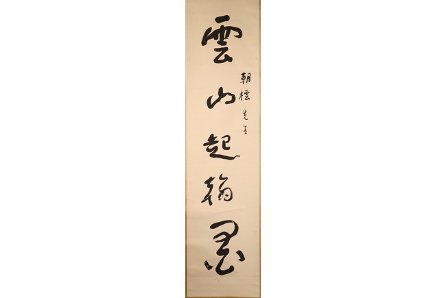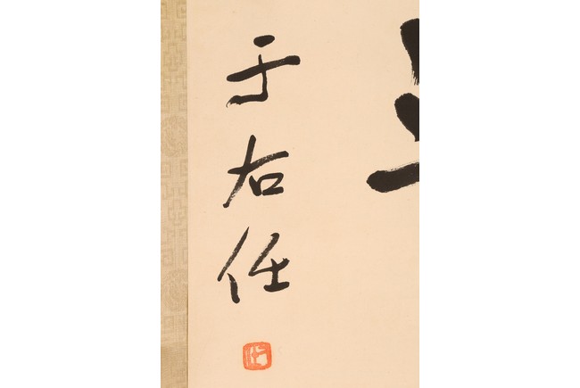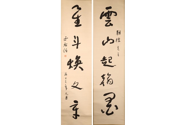 Ink on paper. Hanging scroll. Calligraphy couplet in cursive script. Signed with one seal mark, dated to 1964.