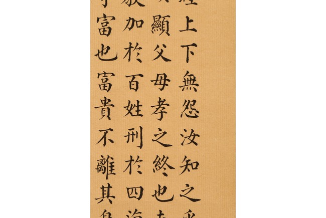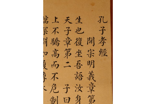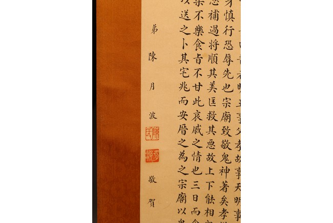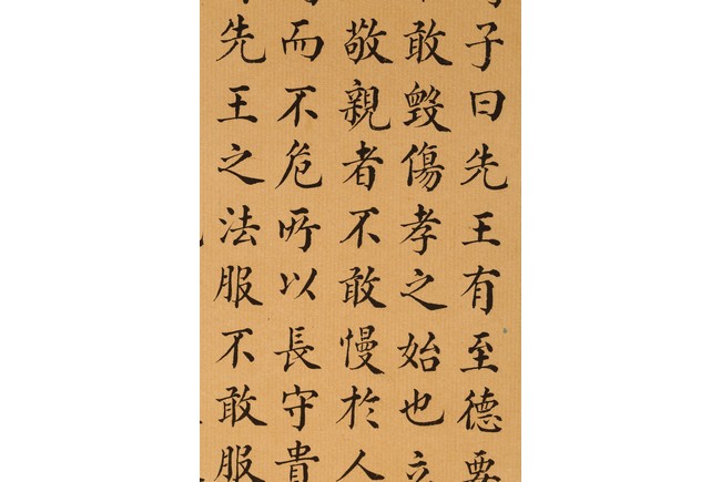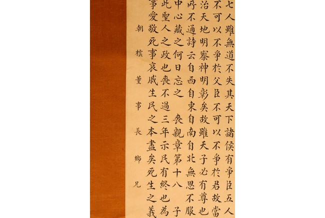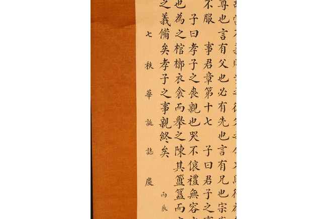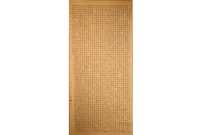 Ink on paper. Calligraphy. Classic of Filial Piety. Hanging scroll. Inscribed and signed Chen Yuebo, and two seal marks of the artist.