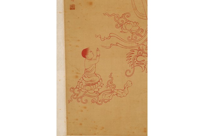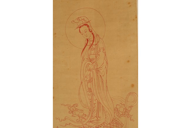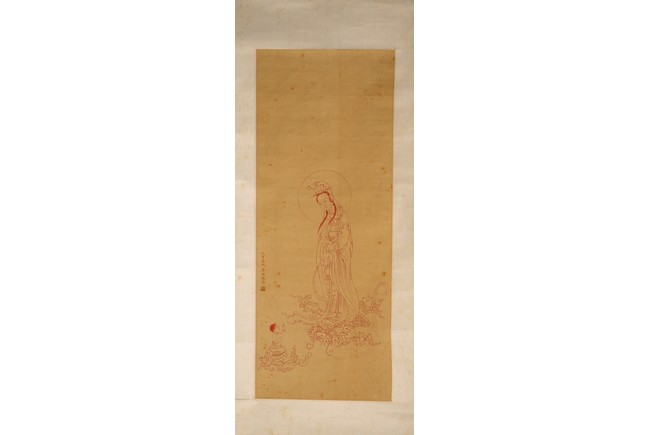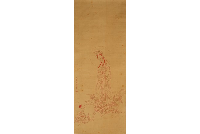 Chinese. Pu Ru (1896 - 1963). Guan Yin and Boy. Cinnabar Ink on Silk. Hanging Scroll. Dated to 1938 and signed Pu Ru, with one seal mark of the artist.