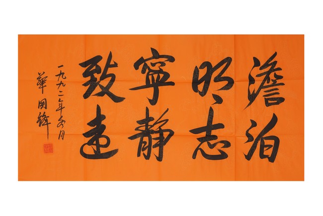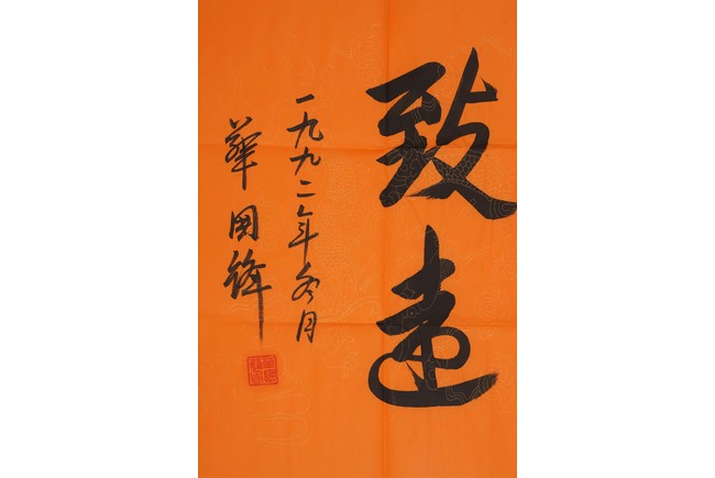 Ink on paper. Calligraphy. Inscribed and signed Hua Guofeng, with one seal mark of the artist. Dated to Winter of 1992.
