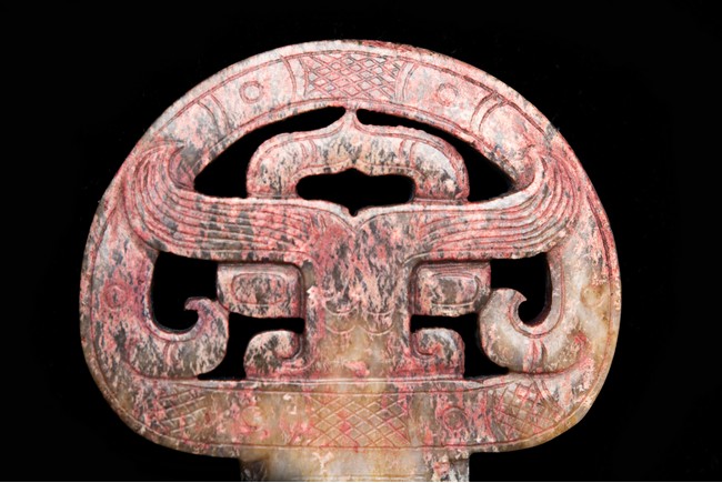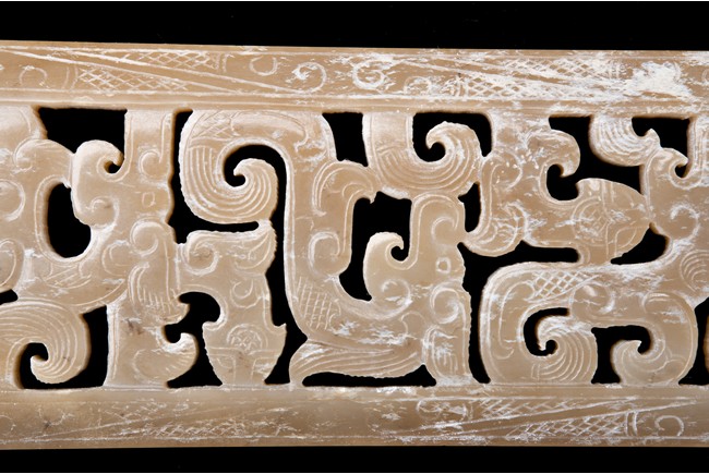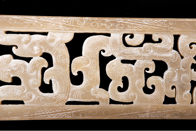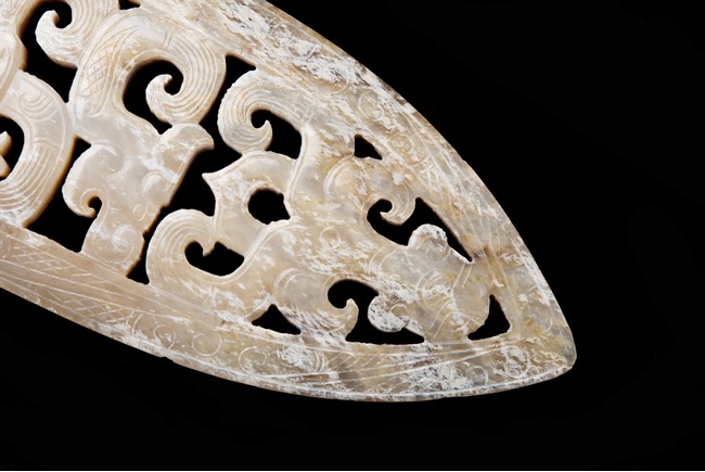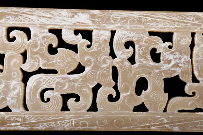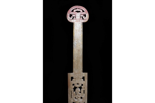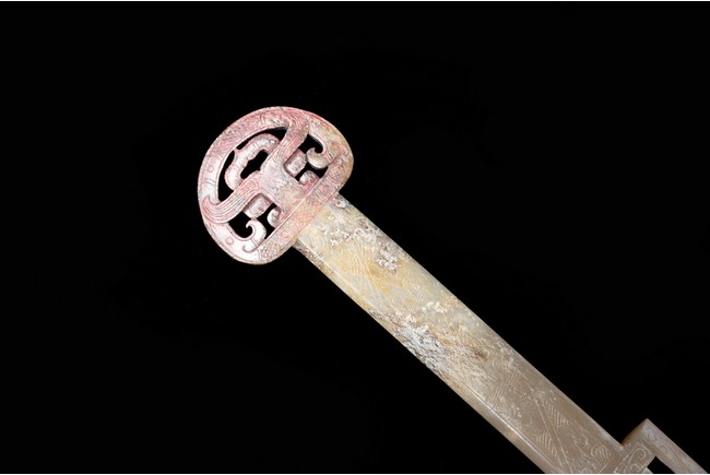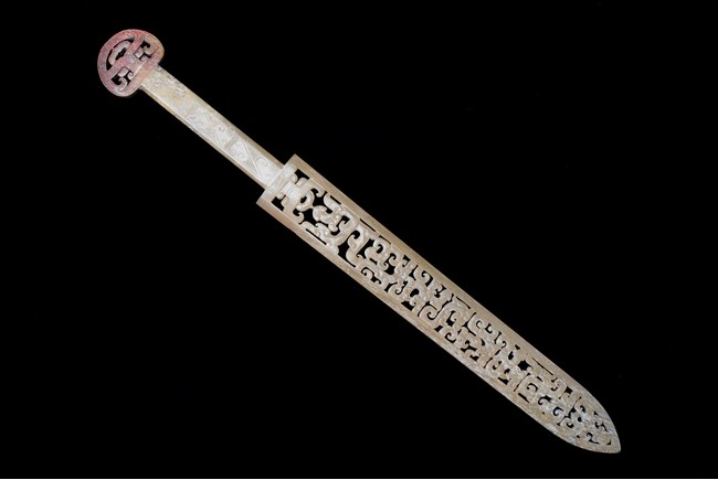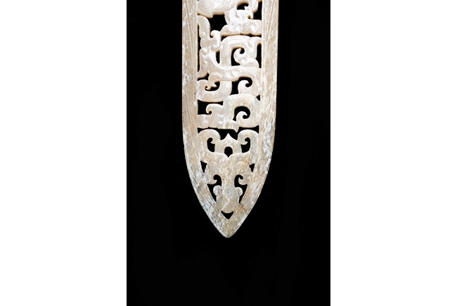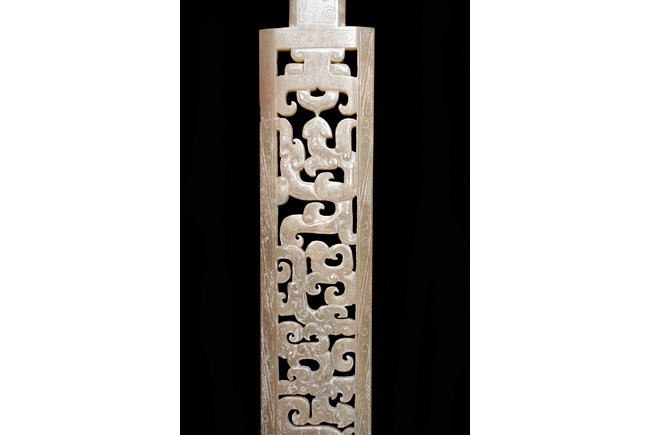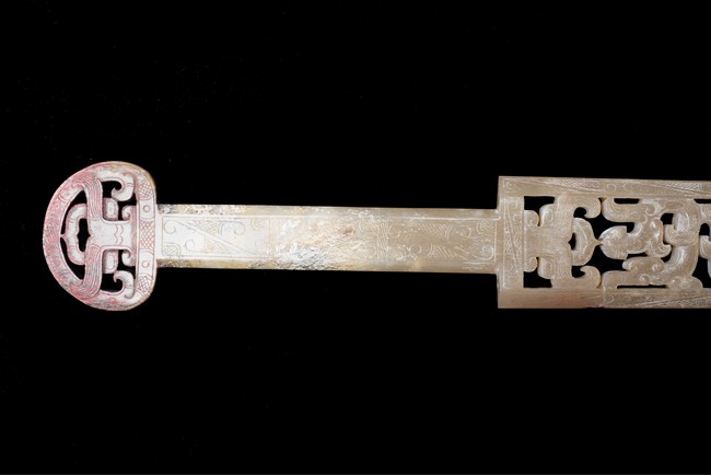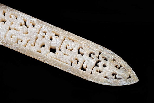 The double edged blade finely carved and pierced in openwork to depict archaistic scrolling kui dragon pattern, the bevelled hilt finely incised with scroll and crisscross pattern, all above an openwork pommel carved in the form of stylized mythical beast head. Han Dynasty period or later.