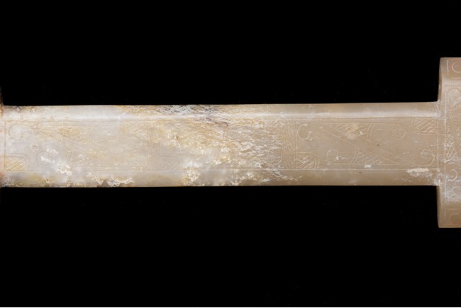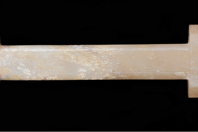 「君子佩玉,小人藏刀」,古人將劍譽爲兵器中的君子,劍被認爲是有君子之德的兵器,故而君子亦常佩之以明志。劍剛正不阿,是爲正直;劍柔韌卻不曲(屈),是爲進退有度;劍無事則鋒芒內斂,是爲謙遜;劍有事則出鞘以止惡,是爲俠義;劍貼身護主,是爲忠勇。劍者無槍矛盛氣凌人的霸氣,無弓矢孤注一擲的霸道,無刀斧趨利而彎的勢利,也無鈍器沉重複雜的內心。劍代表的是俠士,君王,將領,權威和地位,是自翊有身份的人使用的,其權威的象徵意義大於實用意義。而用玉製作劍已經逐步失去了其實用功能,更多的是展示權威和身份的象徵。此玉劍應爲漢代王侯貴族所有之物,灰白質地,玉質通透,瑩潤光潔,表面多處帶有灰白沁斑,劍把帶有紅硃砂沁,造型別致,工藝考究規整,可謂古玉上品。紋飾章法有序,謹嚴之中又富於變化,表現標新立異的風格和漢代雄健渾樸之時代氣息。採用「透雕」「陰刻」等手法,雕飾「螭龍紋」「雷文」「勾雲紋」等,紋飾繁而不亂,規矩大方,刻畫極其細緻,工藝精美考究,包漿色澤無可挑剔,爲漢代玉雕最高水準,實爲極其罕見的收藏佳品。