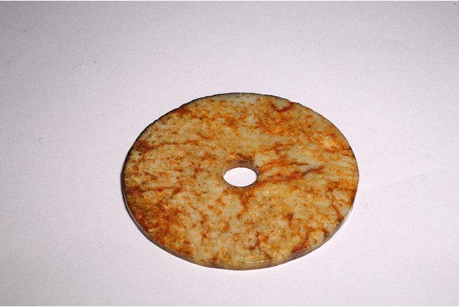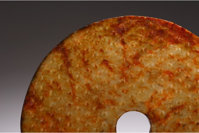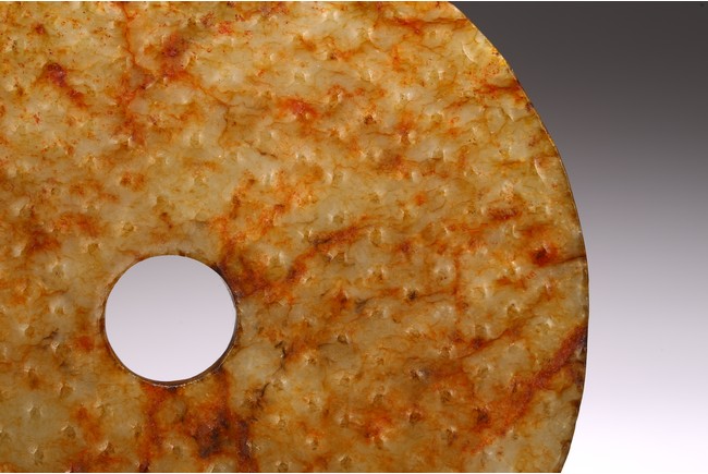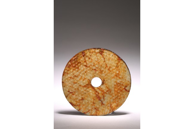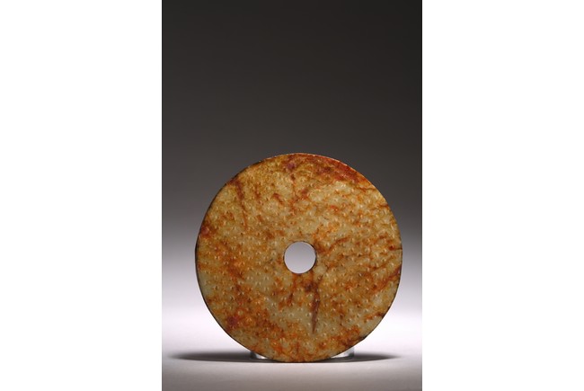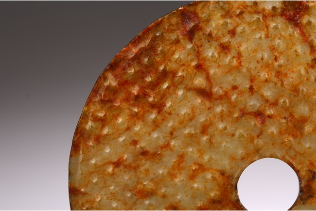 Chinese. Of circular form pierced with a central aperture, densely carved to both sides with the hexagonal pattern, the celadon stone variegated with dark russet veining. Han Dynasty period or later.