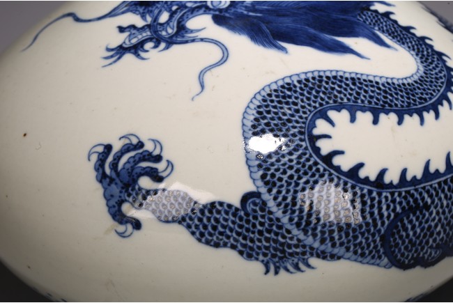 The compressed globular body surmounted by a tall cylindrical neck, finely painted with a large five-clawed dragon chasing flaming pearl above crashing crests, the base with a six-character seal mark. Qing Dynasty period.
