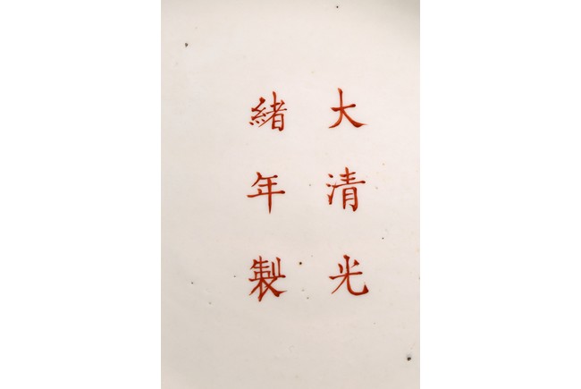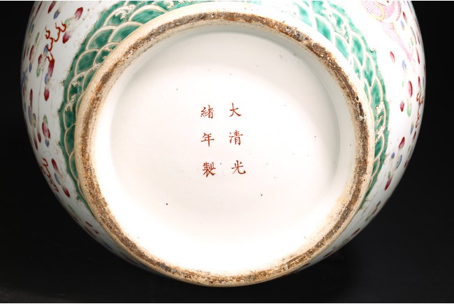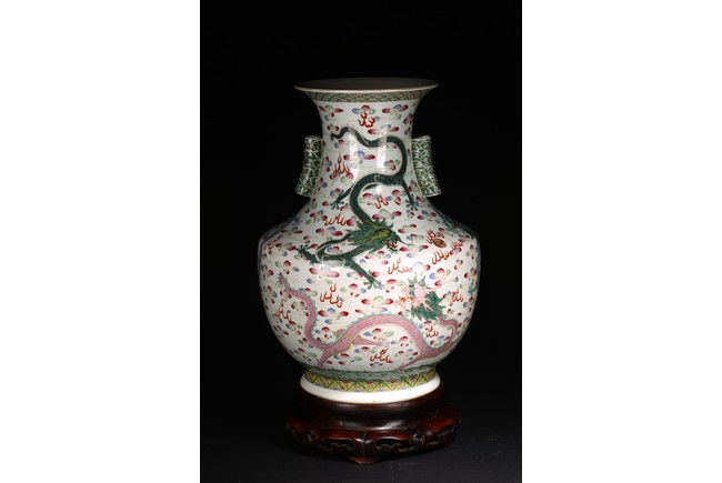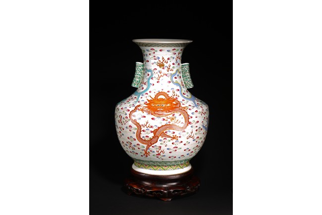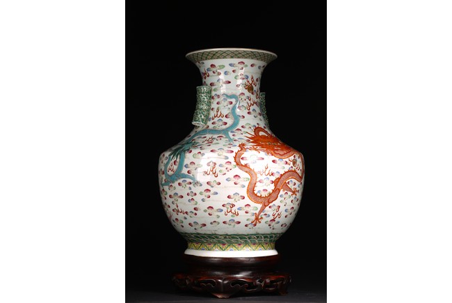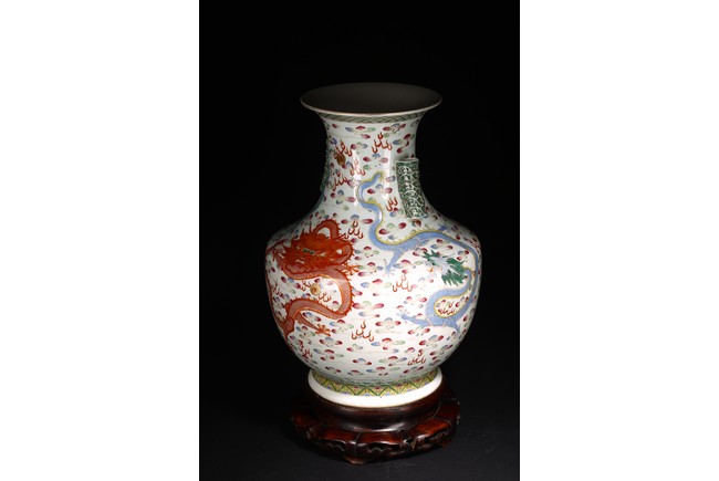 口外撇,長頸,折肩,鼓腹下收,圈足外撇。器身施粉彩繪五龍戲珠,穿梭雲間。龍身矯健,彎曲靈動,雙目圓瞪,張牙舞爪,威風凜凜。周邊襯以火雲紋和祥雲繚繞,下方描繪海水波浪紋,波浪描繪細膩,層疊推進,洶湧襲來,生動逼真,十分難得。“大清光緒年制”款識。配紅木座。