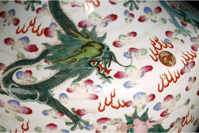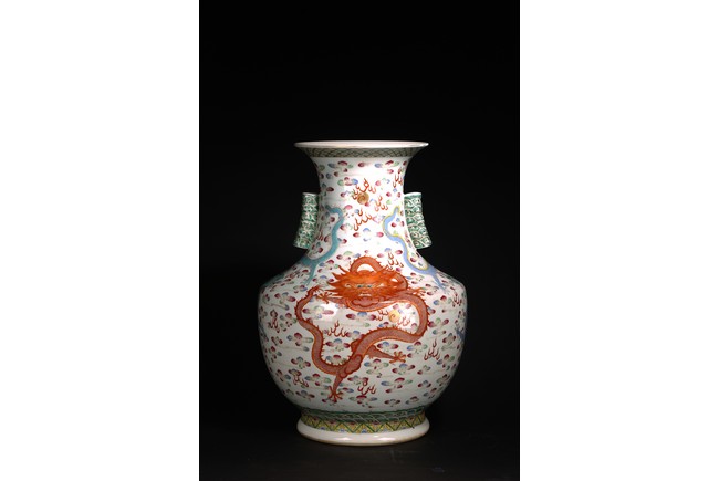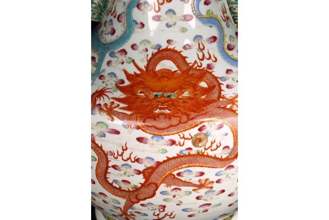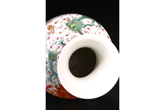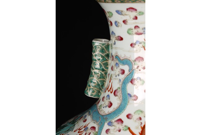 19th/ early 20th Century. The large body rising to tapering shoulder and a waisted neck and flared rim, flanked by pair of tubular handles, the body exquisitely painted with five colored ferocious dragons pursing 'flaming pearls' amidst ruyi shaped clouds, with bands of stylized diaper pattern around rim and foot, the base bearing Guangxu mark and of period.