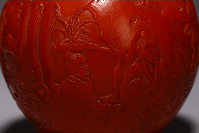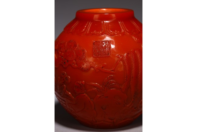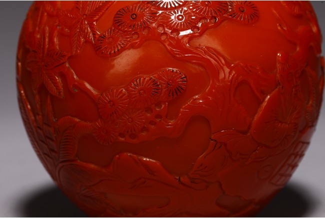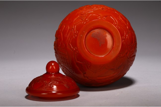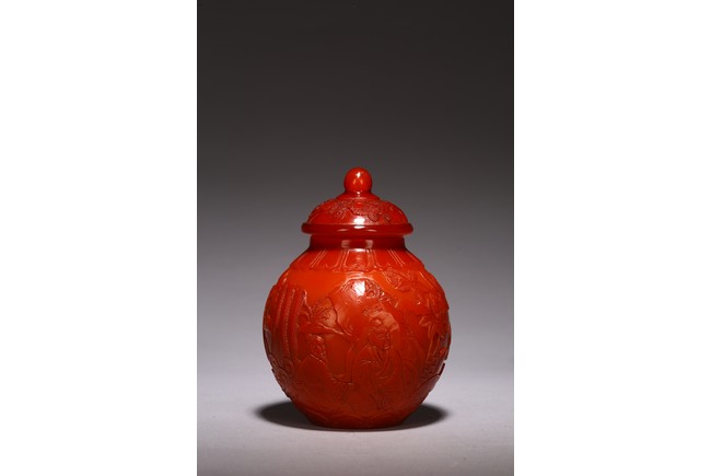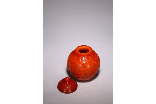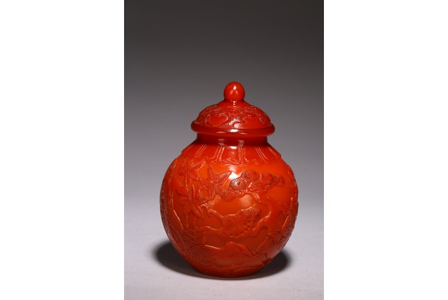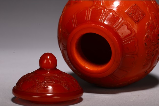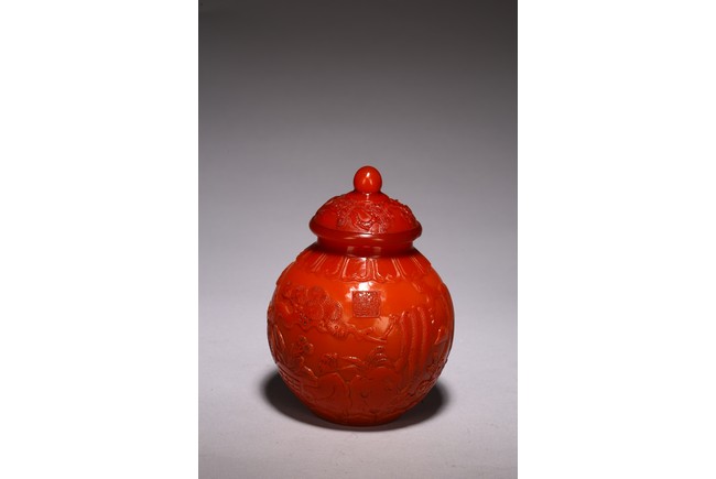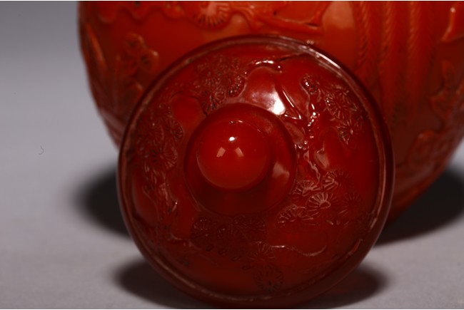 通體琥珀色,料質瑩潤,略透明狀,色澤光潔深沉。料器實爲一種鉀硅玻璃或鉀鈣玻璃。後來,北京內廷玻璃廠燒製的「官料」,人們俗稱其爲「京料」。此件蓋罐保存完整,料質上乘,做工精細,實爲收藏欣賞的精品。
