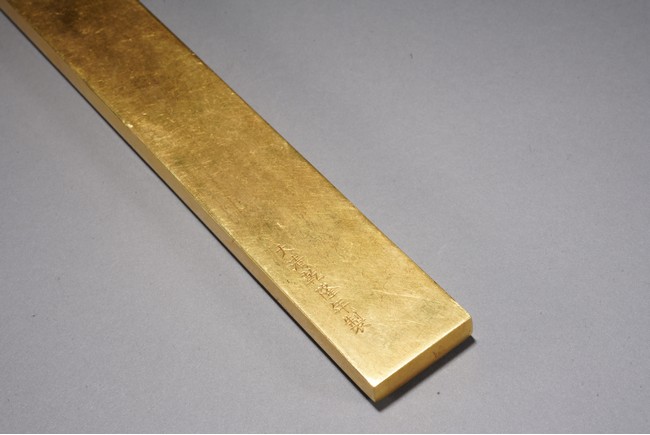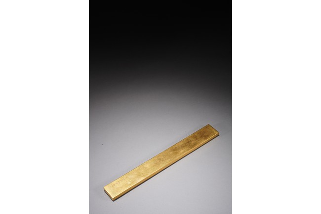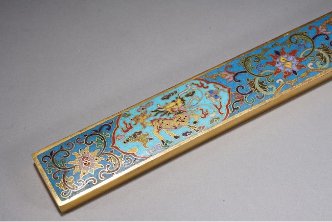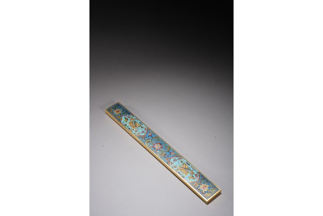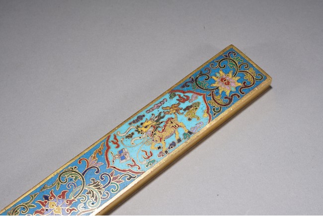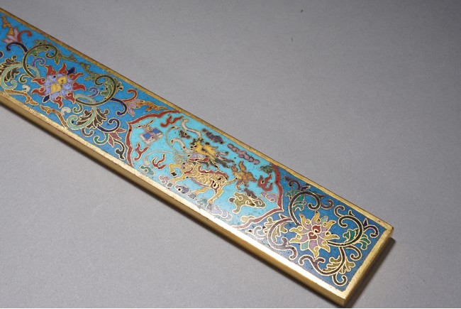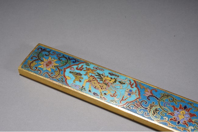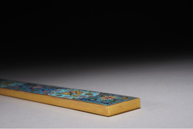 鎮紙的發展在明清時期蔚為壯觀,清代銅鎮紙在沿襲明代風格的同時有所創新,特別是隨著工藝技術的進步,裝飾味道十分濃郁的鎮紙開始出現,可謂集觀賞性與實用性於一器。如銅鎏金琺瑯鎮紙,為清代中期製品,銅胎鎏金,紋飾細膩真實,具有較高的工藝價值,為文房珍玩中的精細之作。