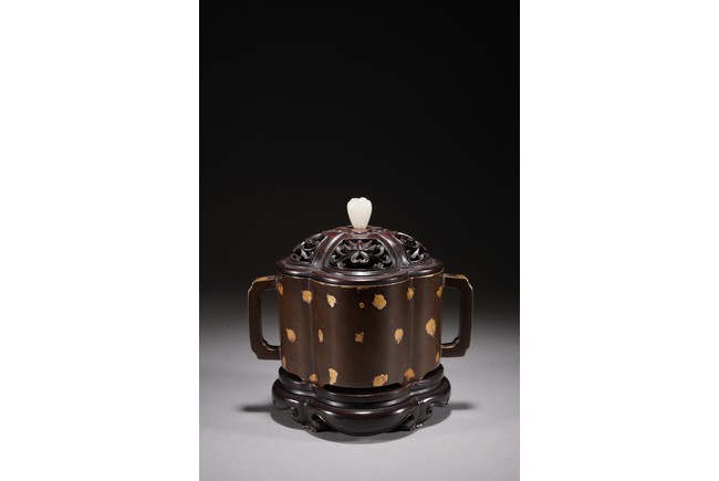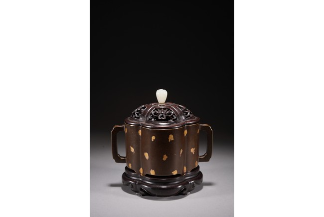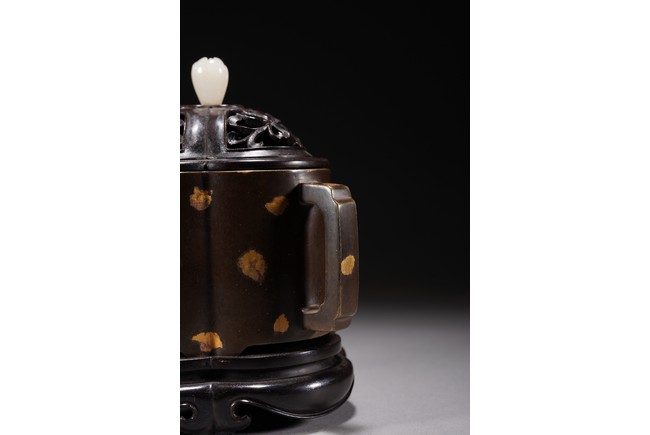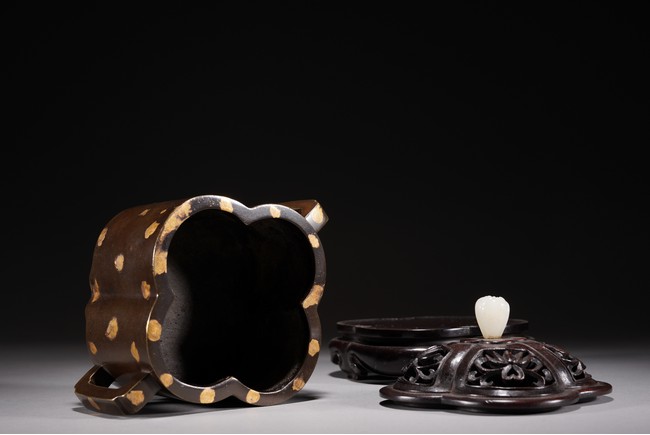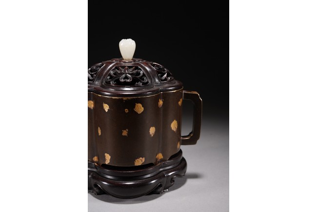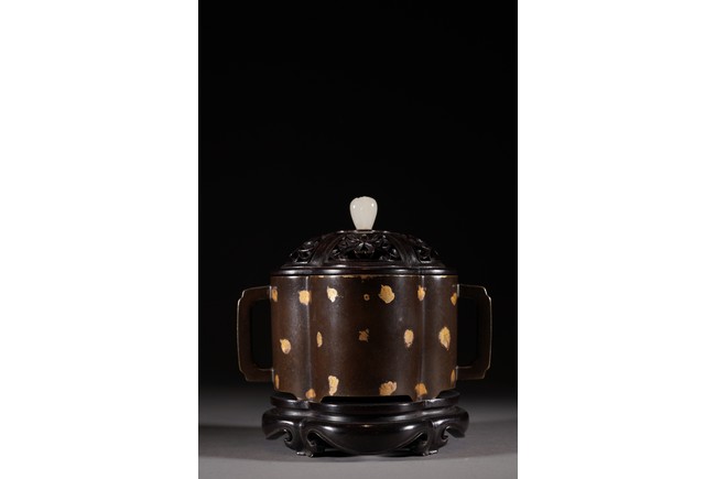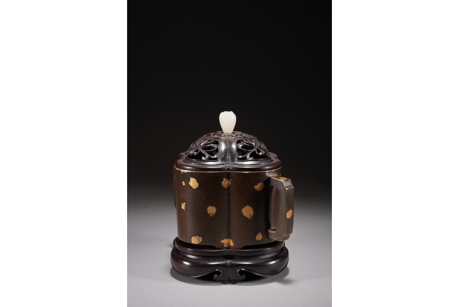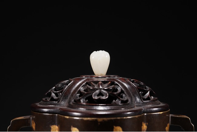 此銅爐雙耳造型,花口直腹,口沿有橋型雙耳,四柱形足,銅點金為飾,樣式古樸典雅,金點閃閃,璀璨生輝。有鏤空頂蓋,鏤雕卷雲紋飾,白玉蓮子紐頂,以做熏香之用。底有私家款識,此爐為名家定制之器,彌足珍貴。銅爐中點金工藝規格非常高,此爐匠心獨特,巧奪天工,華而不俗,實為收藏把玩之精品。