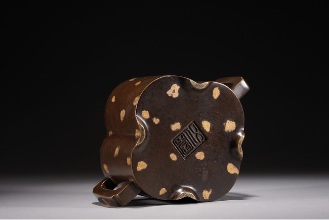 Of quatrefoil section, the body and rim decorated with gilt 'splashes' in, the base with a two character mark. Qing Dynasty period.