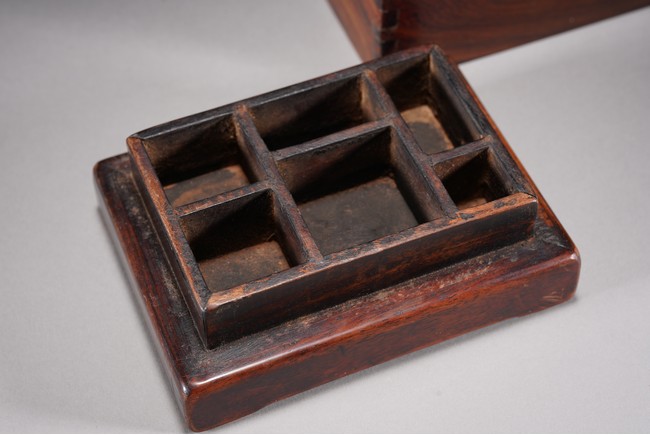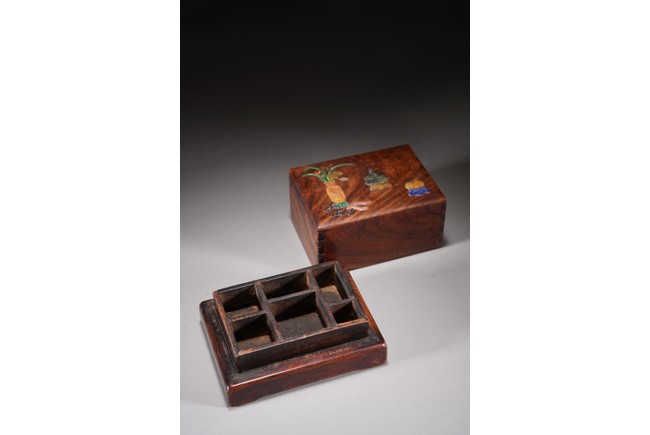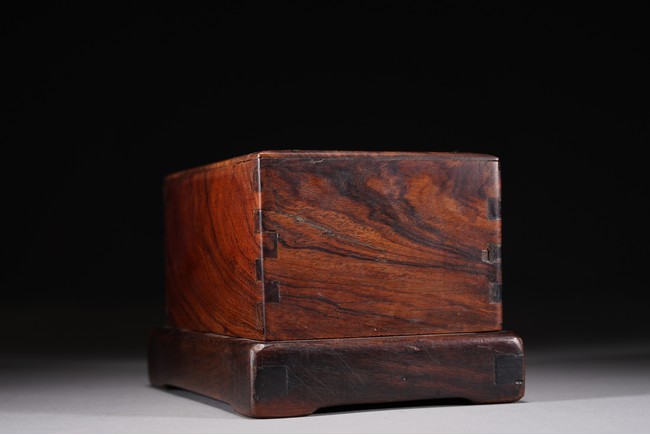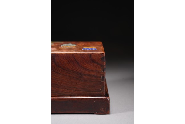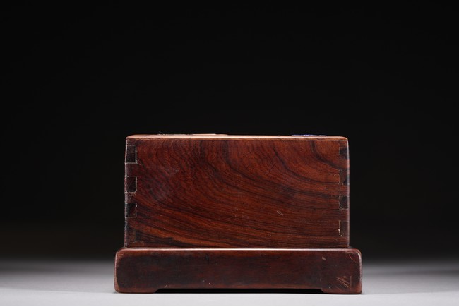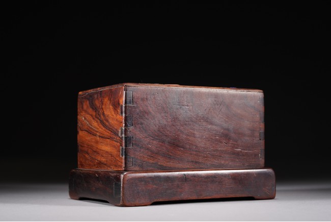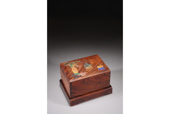 黃花梨材質,用料名貴,多年盤玩摩挲,包漿溫潤紅亮,面板榫卯結構,原裝原配,蓋盒多寶鑲嵌博古紋飾,古樸典雅,文房使用賞玩佳器。