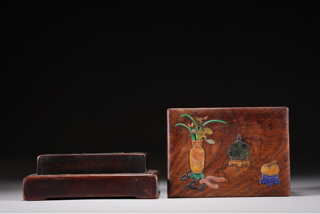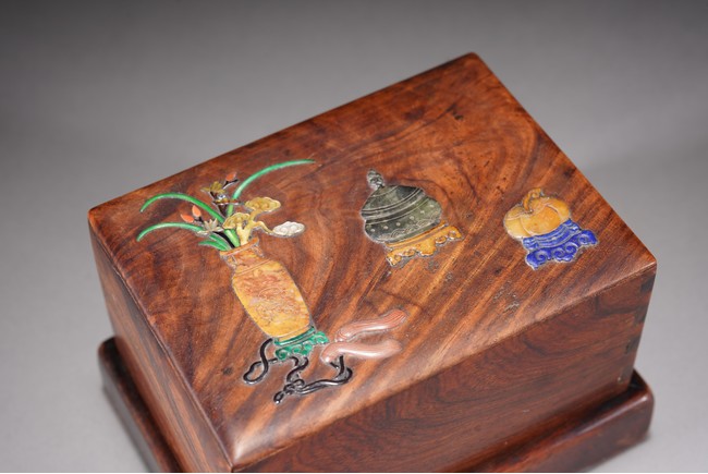 Of rectangular form, the top inlaid with soapstone, agate, mother of pearl, lapis lazuli, malachite, etc. to depict flower vase and censers. Qing Dynasty period.