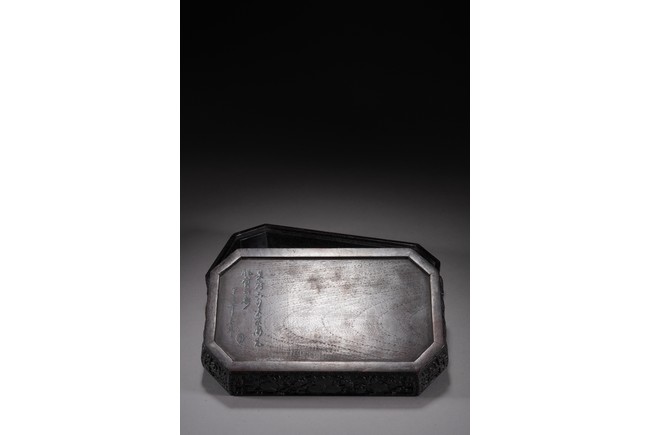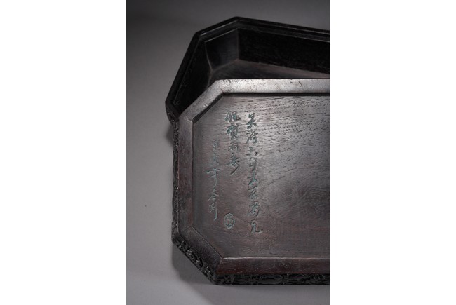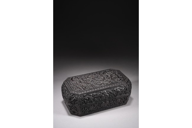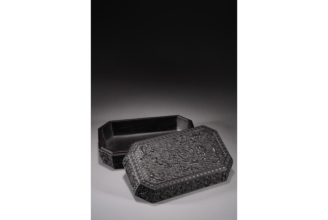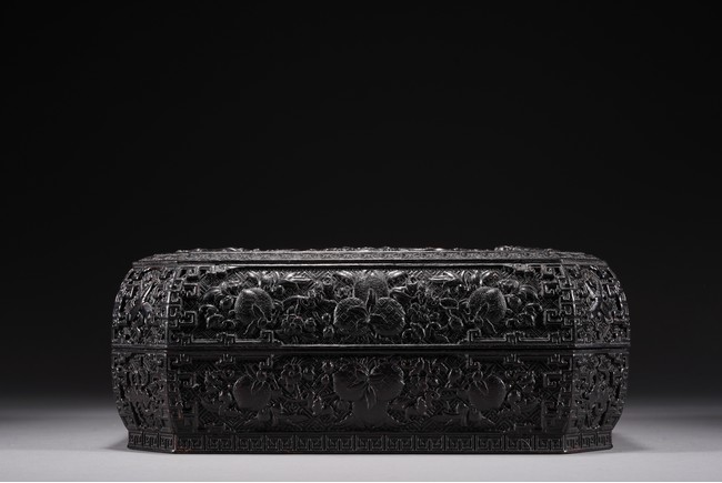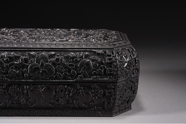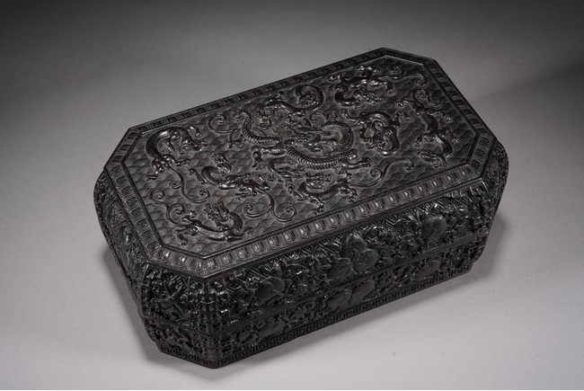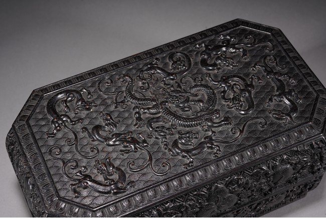 Of octagonal form, the exterior carved with dragon surrounded by smaller chilong to the lid top, the sides with leafy peaches and auspicious motifs. The base inscribed with inscriptions.