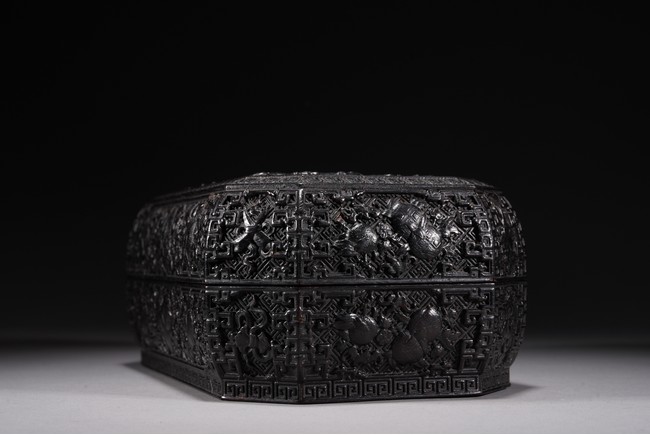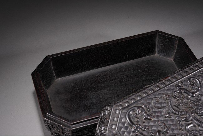 蓋盒紫檀材質,用料奢華名貴,整體榫卯結構,子母口,八方形蓋盒,上下嚴絲合縫,正面滿雕海水龍紋紋飾,螭龍與正龍交錯舞於海水之間,氣勢恢宏,側板滿雕福壽紋飾,宮廷氣息顯著。