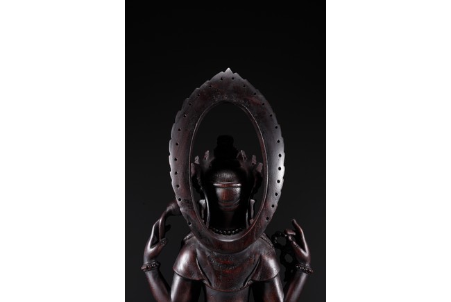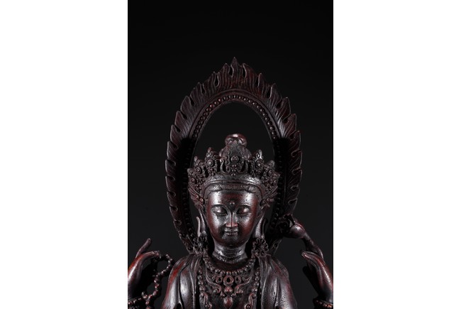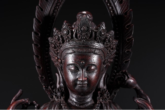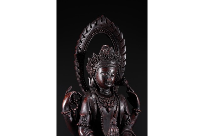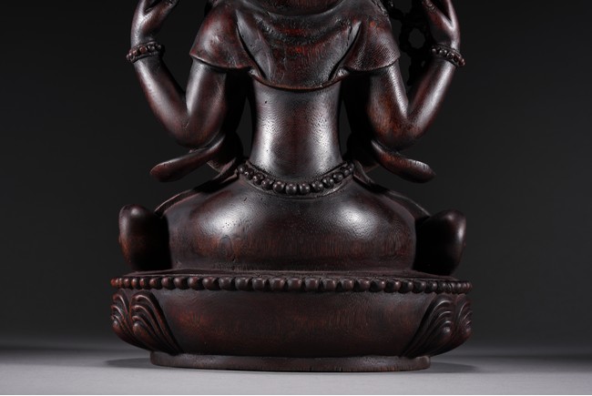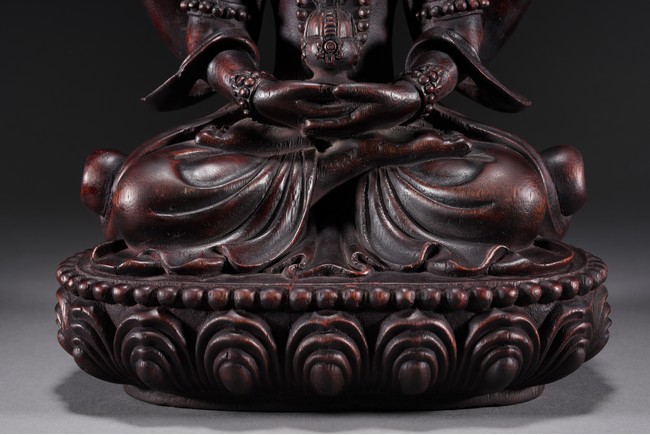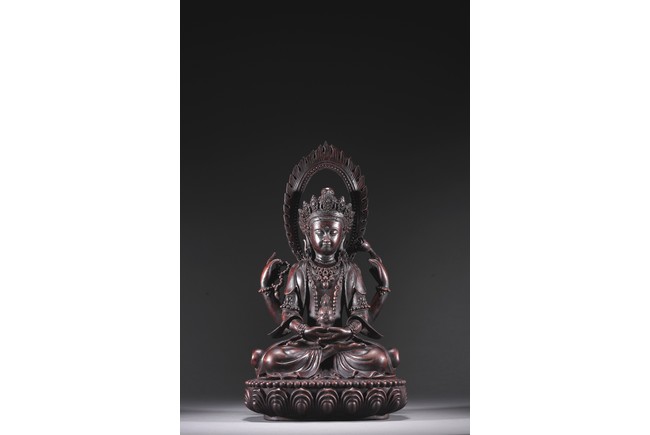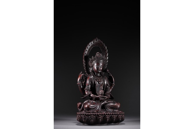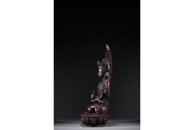 Carved Guanyin seated on lotus throne, two hands holding a vase, wearing elaborate jewelry and backed by flame mandorla.