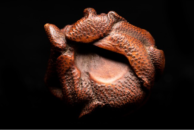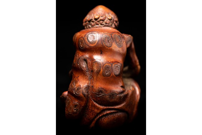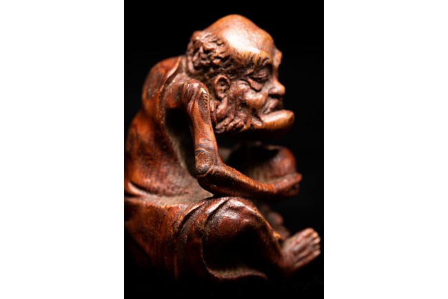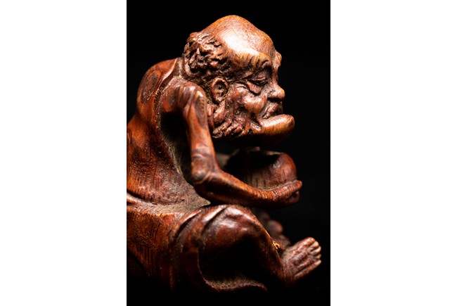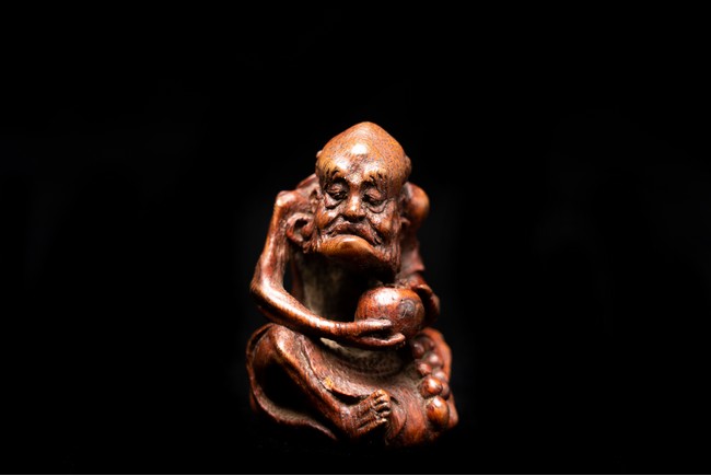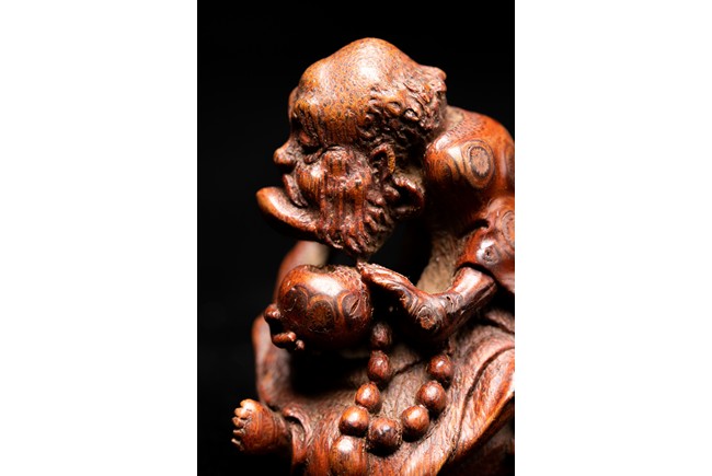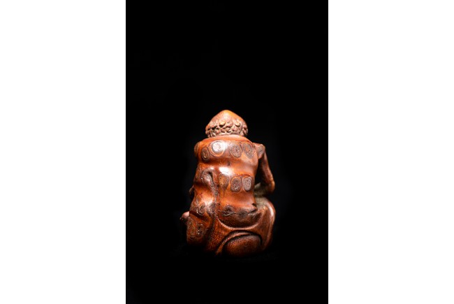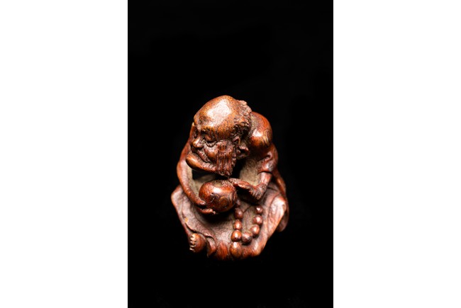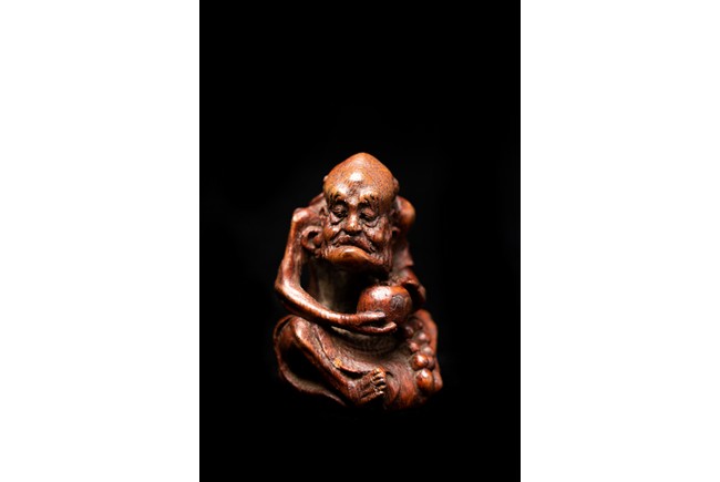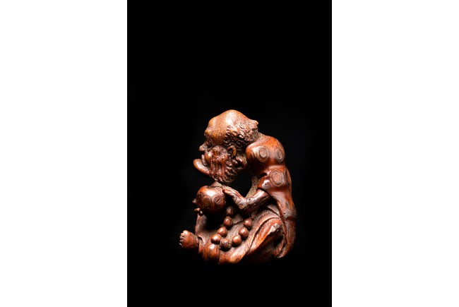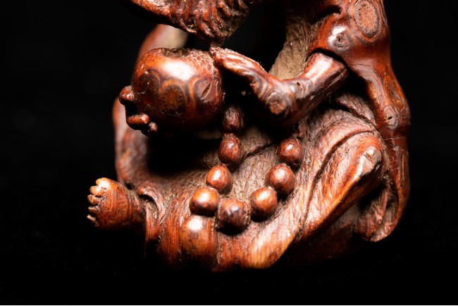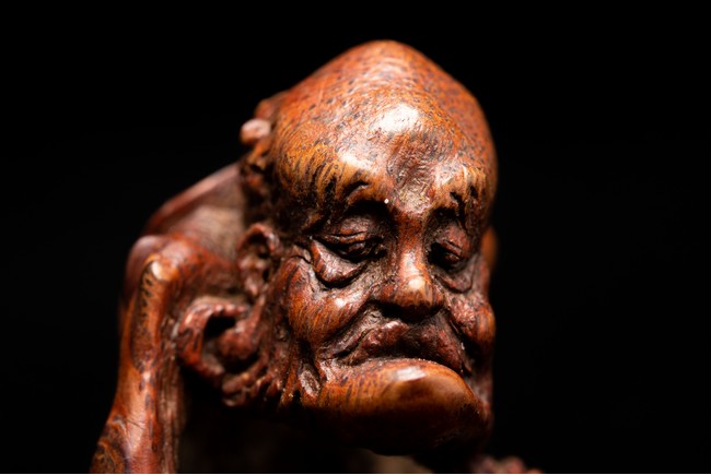 竹雕製成,精工雕琢而成,竹色紅潤,造型秀雅,羅漢面形豐潤,雙目微閉,神態憨樸,眉宇、眼部和鬍鬚刻畫細緻,頭頂高聳,彎眉高鼻,身着長袍,左手持佛鉢,右手持念珠。整器採用用圓雕、高浮雕技法,技法精湛,構思巧妙,栩栩如生,包漿渾厚潤澤,古雅宜人。