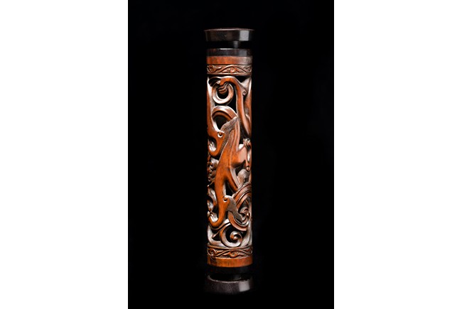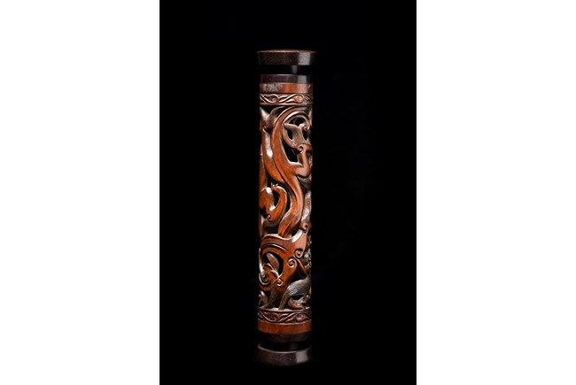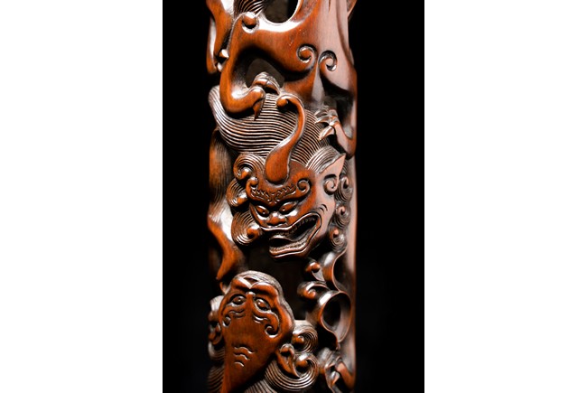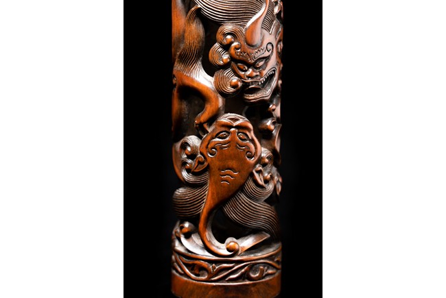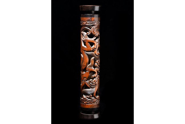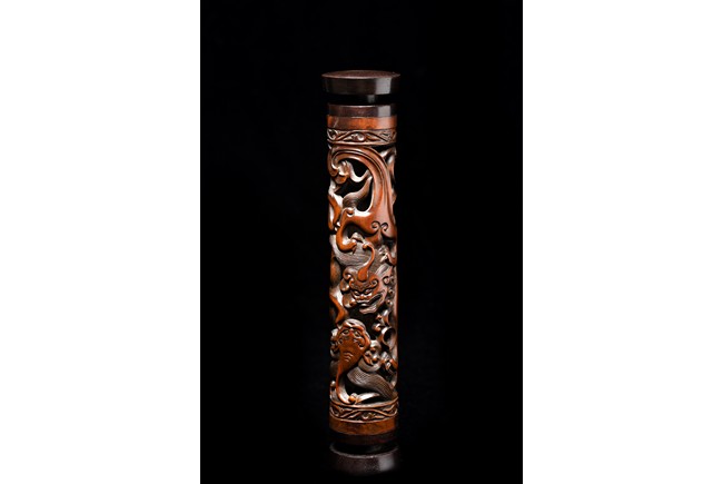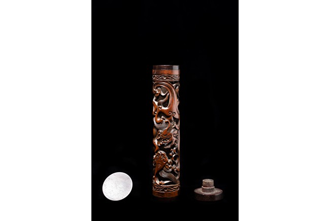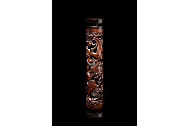 香筒是古人四藝之一,人文雅士的必備之物。若香筒內點燃檀香木,香菸從香筒的孔洞中冒出,營造出香菸燎饒、香氣宜人的神祕氣氛,讓人留戀難捨。此件香筒配紫檀木蓋、底鑲嵌,直筒身,取黃楊木製成,其色褐黃,包漿滋潤。採深浮雕兼透雕法,通景繪「螭龍紋」,螭龍表情生動,身姿舒展自如。整器用刀如筆,遒勁有力,雕刻工藝精湛,佈局巧妙,層次清晰,繁而不亂。