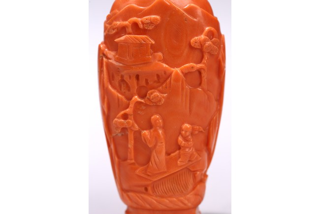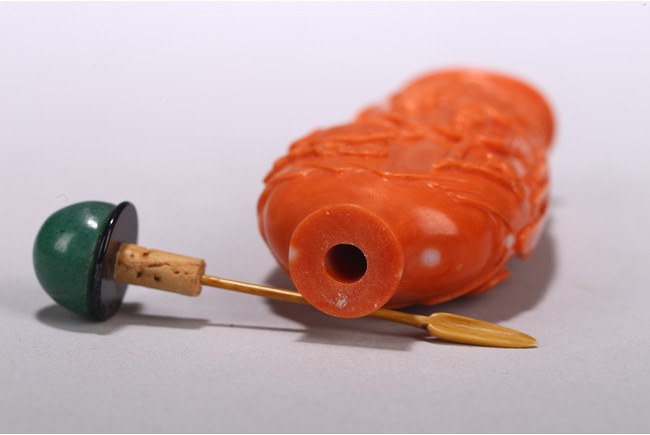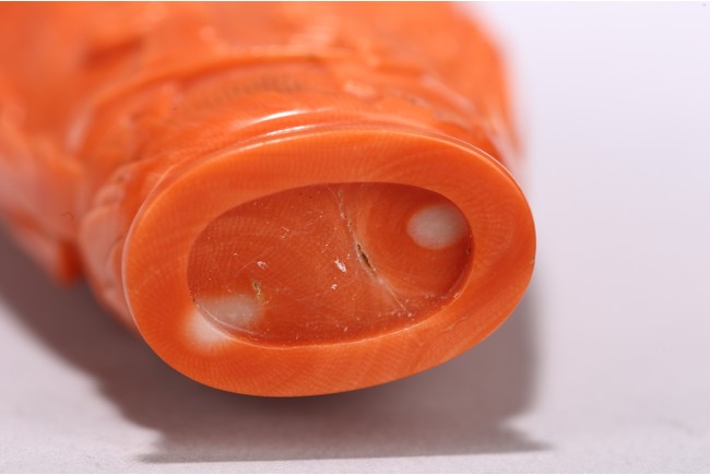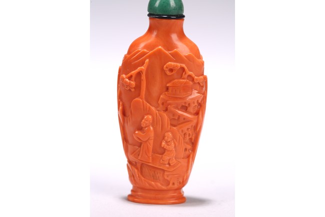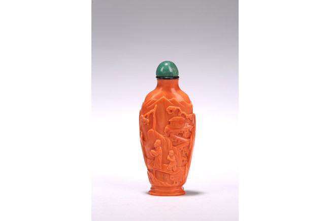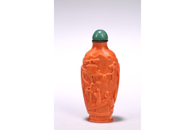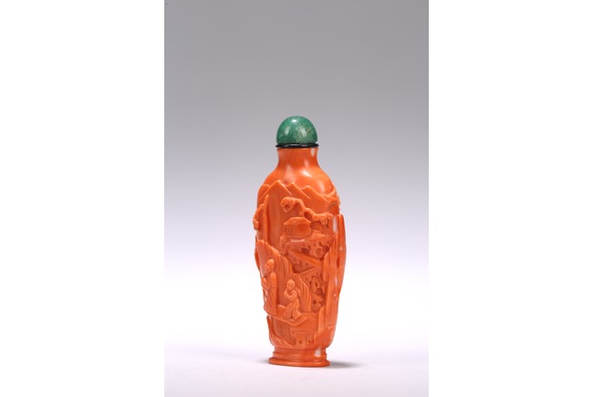 Of slender ovoid form,the snuff bottle carved around the body with continuous scene of an elderly figure accompanied by a young attendant striding on bridge within a mountain landscape,the reverse with similar scene of elderly figure and young attendant,fitted with stopper. 18/19th century,Qing Dynasty period.